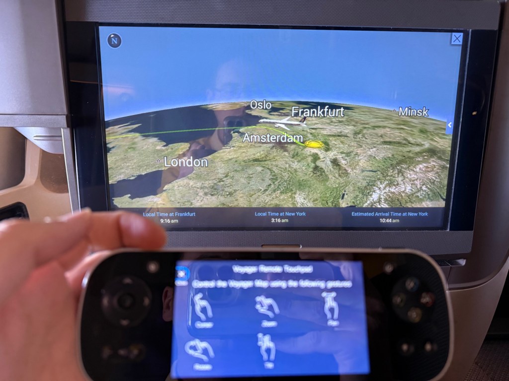 As I said, for me the moving map is usually one of the more interesting features in the entertainment system, so I turned this on whenever I wasn’t watching a movie. Meanwhile, the controller shows you what gestures to make to control the viewpoint of the map.