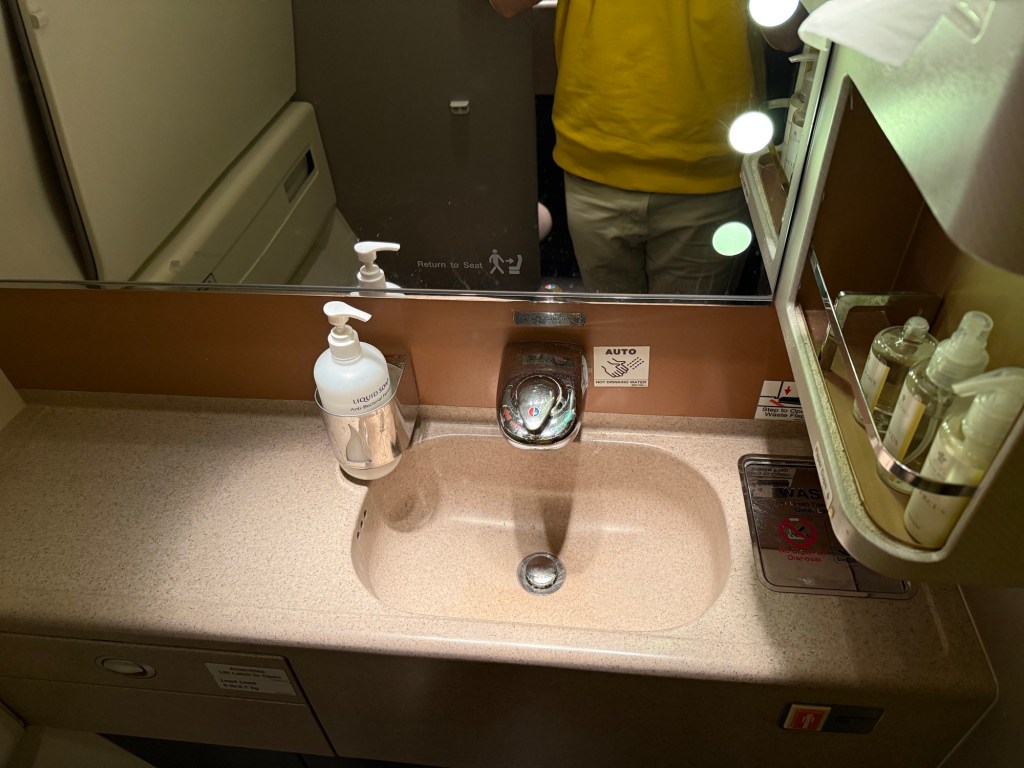 The actual meal wouldn’t start until a bit later so I took the opportunity to visit the lavatory. Business class has lavatories around the galley area around the second set of doors. These lavatories aren’t particualrly spacious, but they were kept clean, tidy and very well-stocked with amenities.