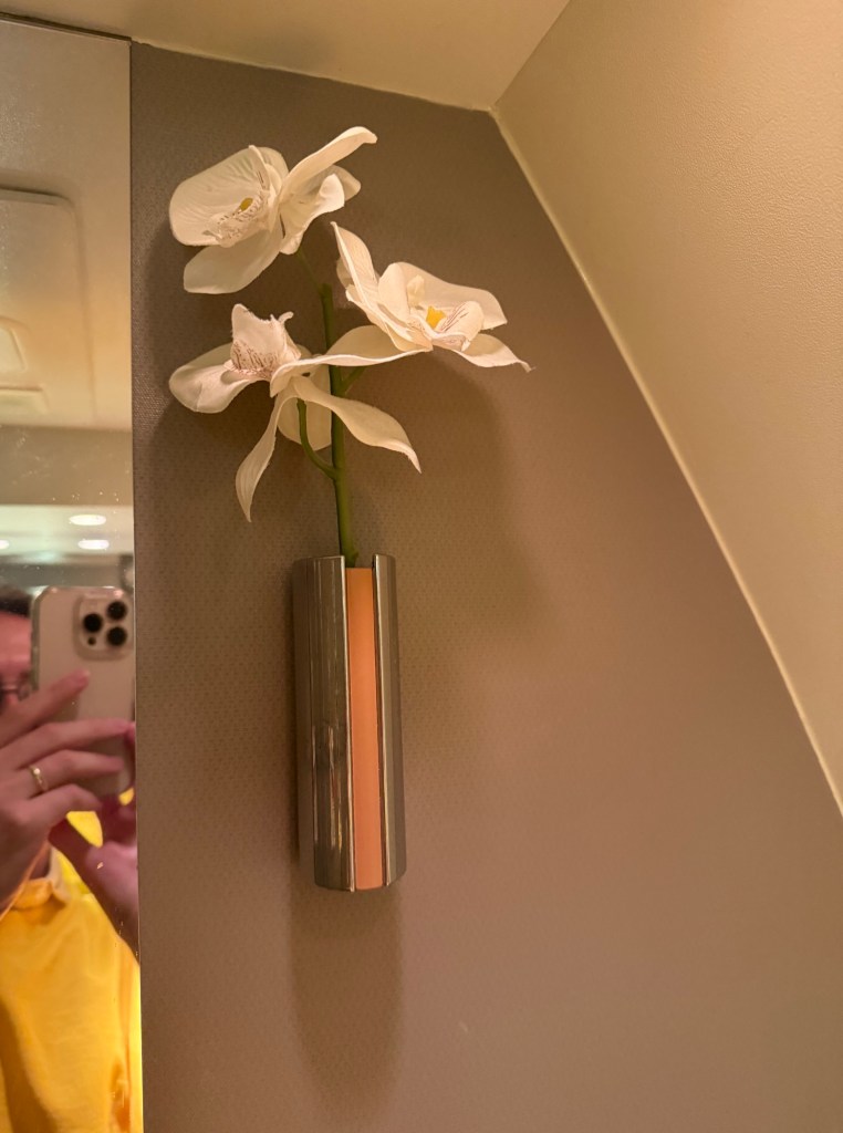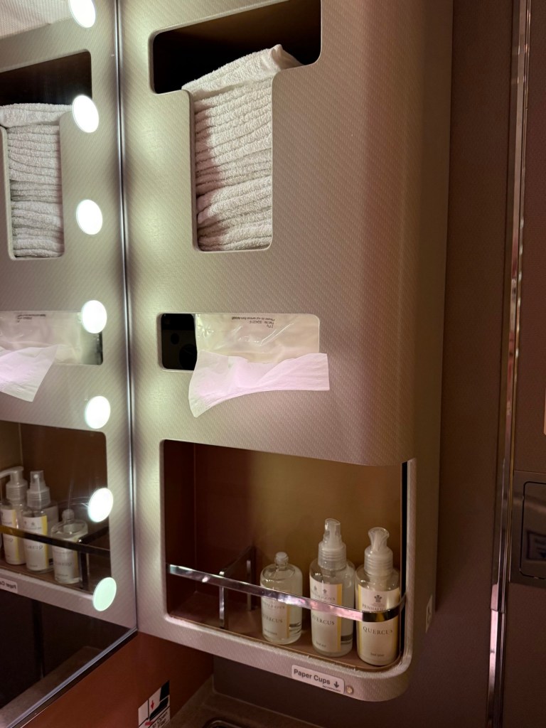 As you can see, there was a nice flower decoration on the back well, and there was also a long mirror there, for a full view of yourself. Then, the front mirror had a series of bright lights along the edges, which oprovided soemthing of an even lighting. Along the right side, by the door, was an upper compartment with actual cloth towels that were felt rather luxurious for an aircraft, as well as paper tissues in the middle. At the bottom were a selection perfume, facial mist and hand lotion by Penhaligon’s Quercus, which for as far as I can tell is a middle-to-premium brand based in London.