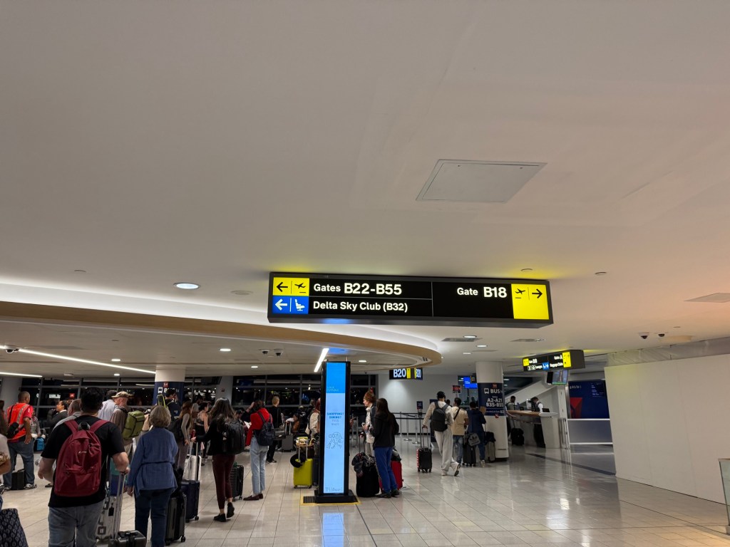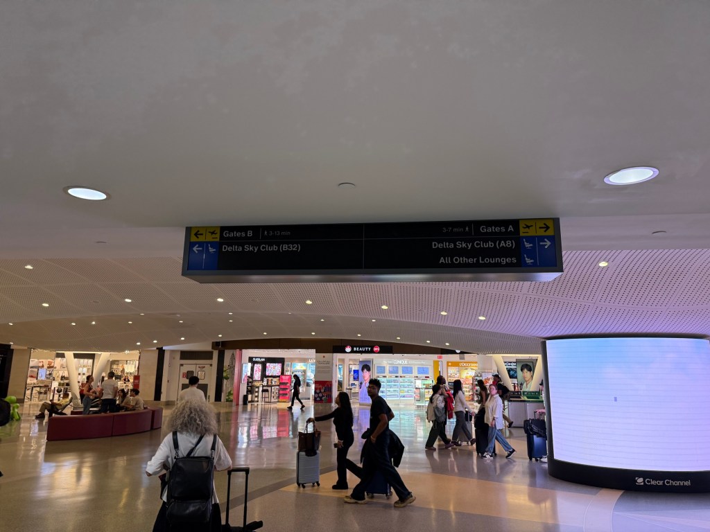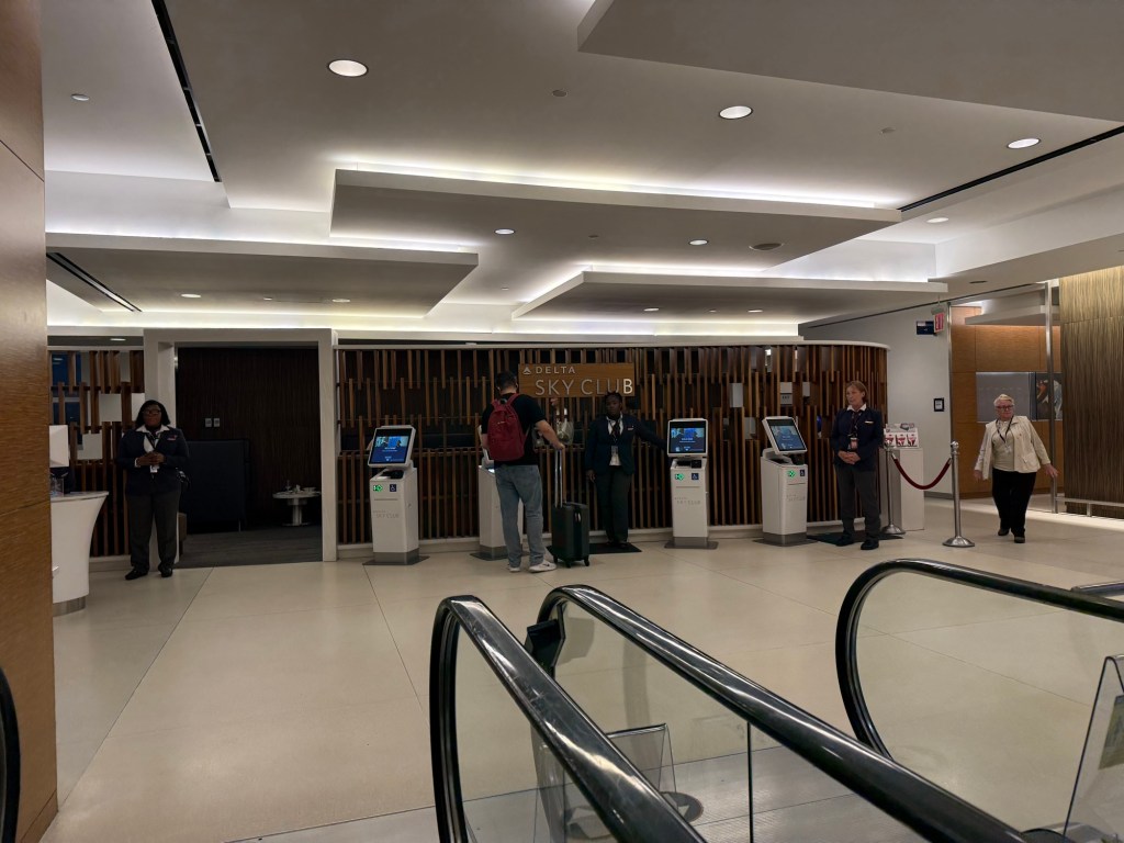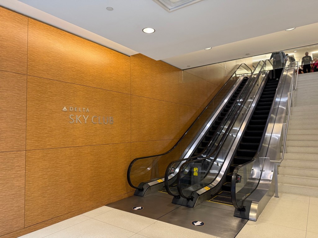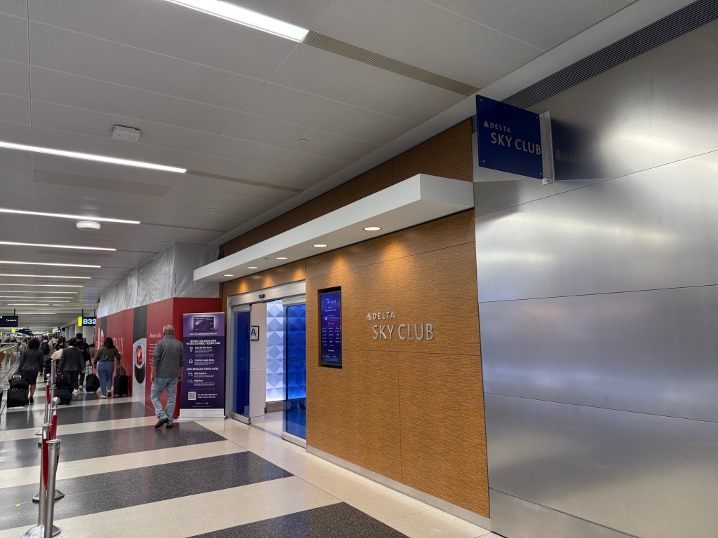 Mind that there are three Delta lounges at New York-JFK Terminal 4. The signage is very clear, so for the most part you can follow it readily. To get to the Delta Sky Club that this review is about, go down one floor to the main concourse level, and take a left, toward the B-gates. Keep following the hall until you get to around gate 31, and you’ll find the entrance to the lounge on your right.