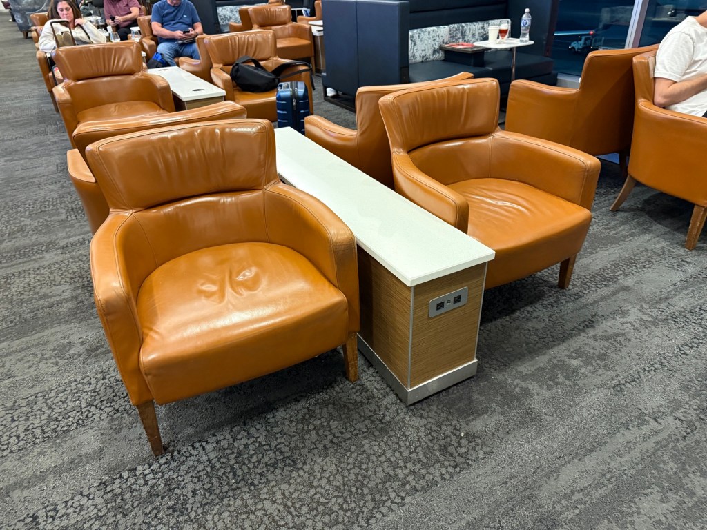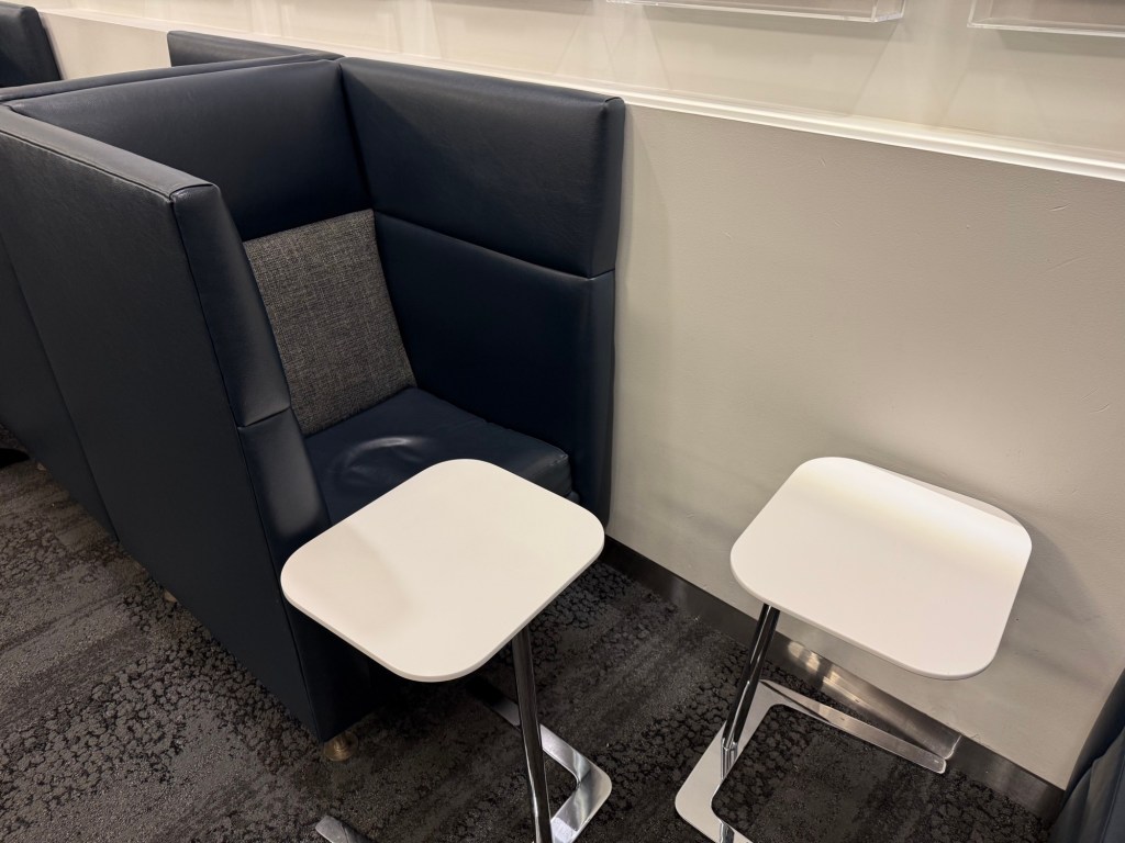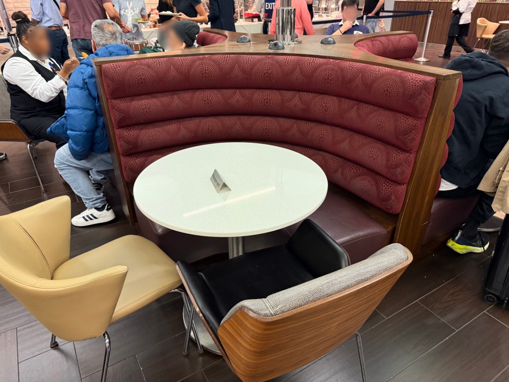 Keep walking down further and on the other side you’ll find a variety of booth-like chairs with higher walls, a larger communal table, and a variety of booths arranged in pairs. This actually seemed a little strange to me because such chairs would usually be deployed for increased privacy, but arranging them like this suggests you’d sit here with a travel partner instead. This space also had a drink station with both hot and cold options, though I’ll get to this later.