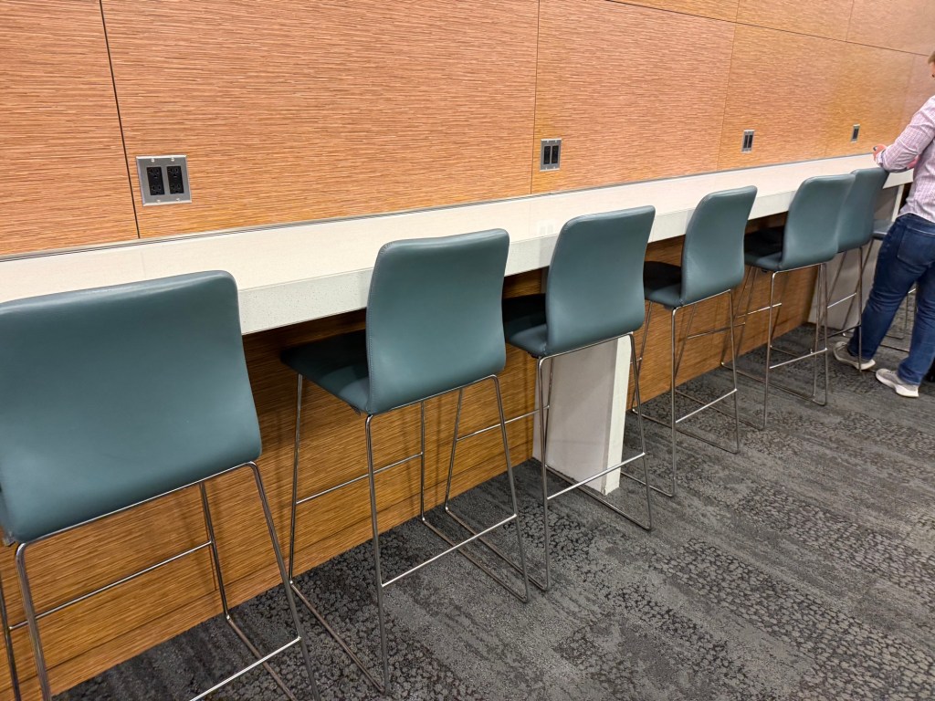 If we now pass through a wide corridor, we get into another one of those long halls. As I had mentioned, there’s one of these one each side of the lounge, and so you can get here by passing through the dining area. The design of this space is pretty much identical to the one to the othe side of the dining area, with similar furnishings as well. On the one end, you’ll find some of those ‘booth’-like chairs with high-wall seperations, different kinds of lounge chairs arranged in pairs or quads with side tables, and some high-top seating both along the left wall and along the windows to the other end of the lounge. A lot of these have plugs, either in the walls or in the side tables.