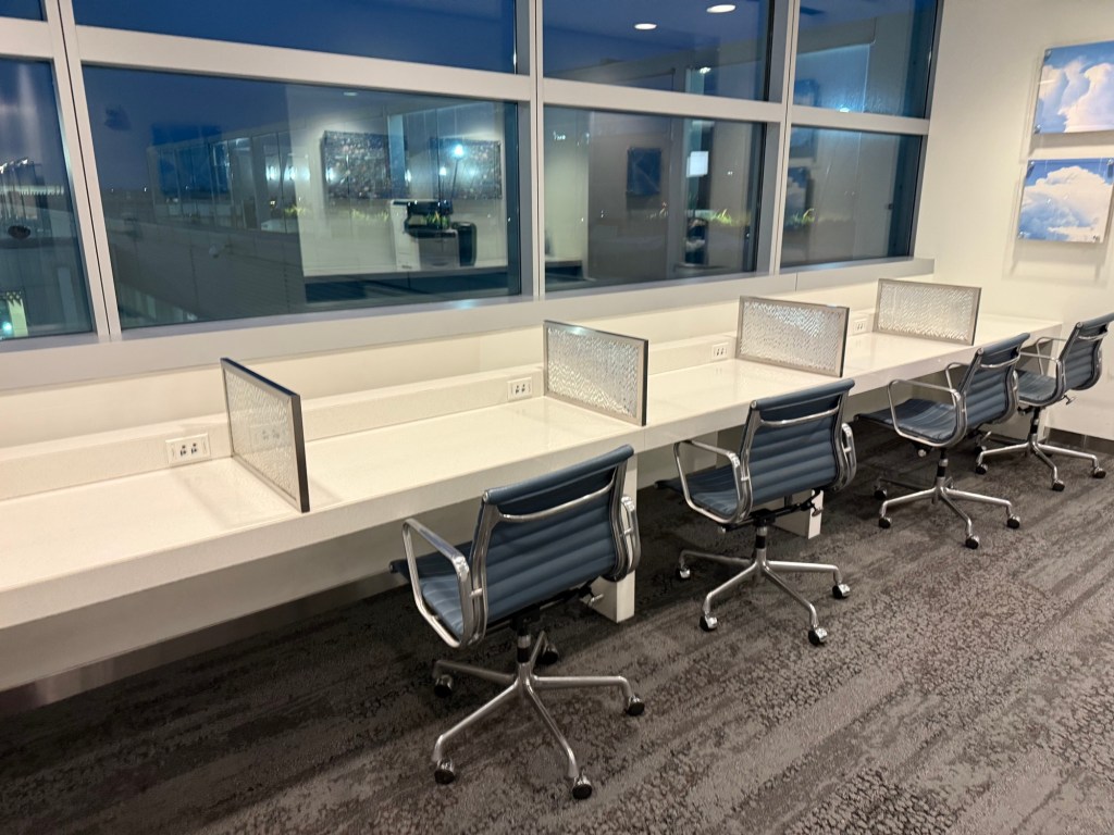 In the back of this space is something of a working, or office area. This is essentially a rather narrow L-shaped space, with a long table with small seperations all along the windows. The views here are of the apron to the other side of the B concourse, and provide great views of Singapore Airlines 777s, Emirates A380s, and many other great-looking planes. In this space was also a printer, though no desktop computer.