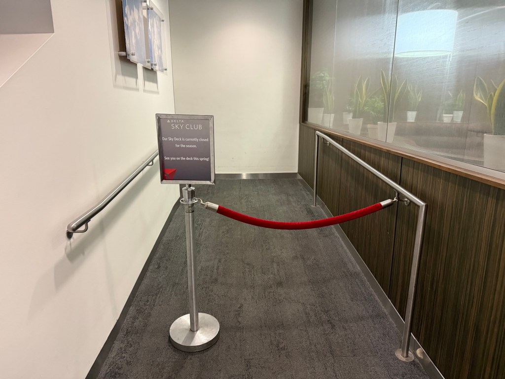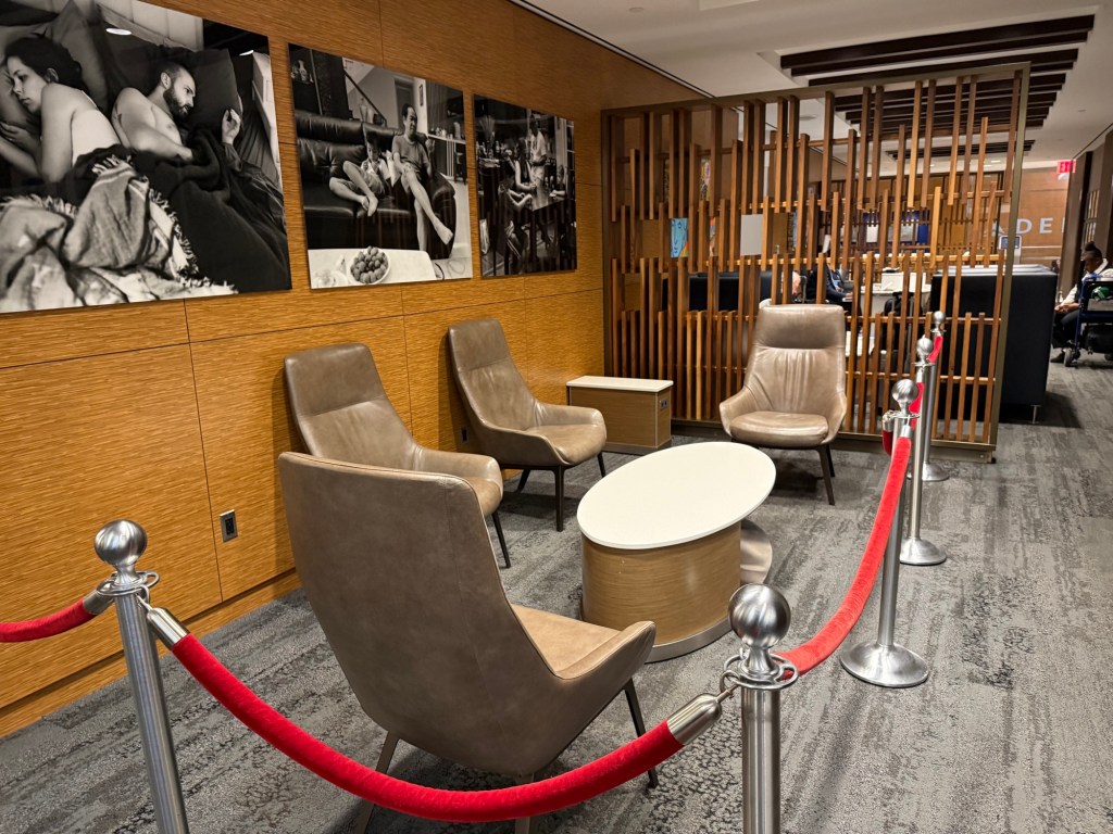 Lastly, back in the long space we just left, there is a corridor that leads from that space back to the lobby. There’s actually three: from closest to furthest, the first one is pictured below. Here you will find a roped-off area that I assume is for Flying Blue Ultimate members, as well as a variety of other comfortable lounge-style seating, as well as customer support desks with Delta staff. The other two corridor get you to either the restooms, or to the showers, and these both ultimately connect back to the lobby.