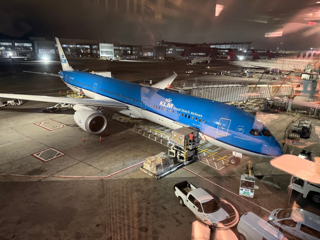 Here’s an awesome thing: The views of the apron started all the way when I turned left from the lobby and remained available all the way down the room. So when I had a look out the window here, I was greeted by a fabulous view of the KLM Boeing 787 that would be carrying me over to Amsterdam!