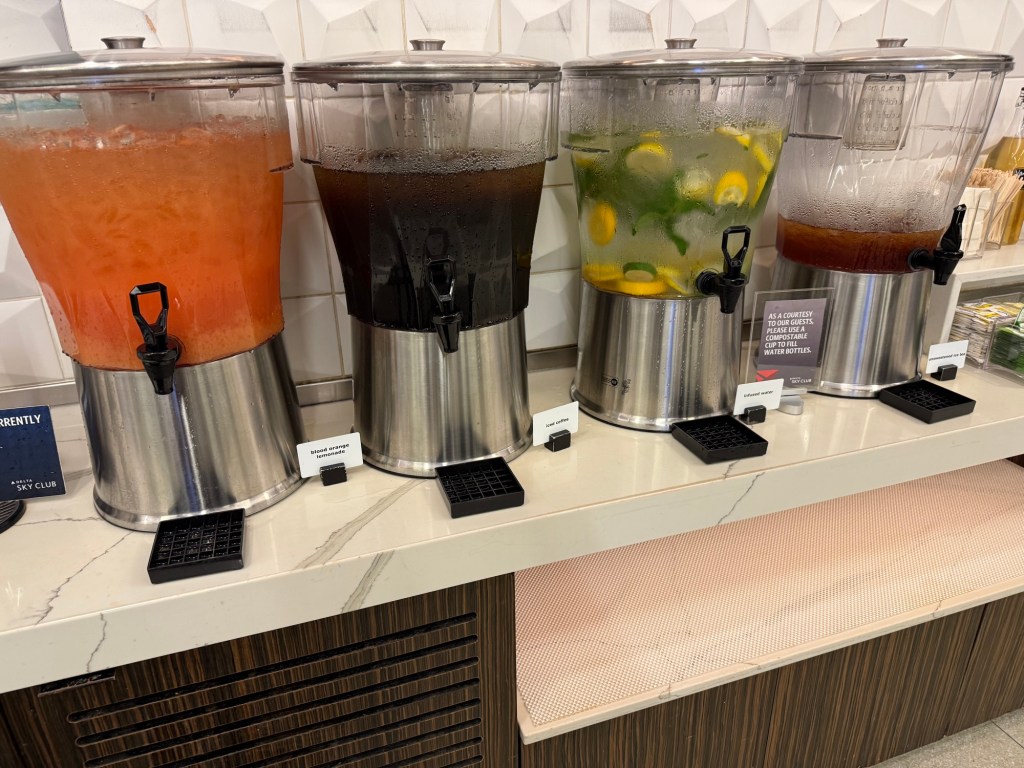 Then, scattered around the lounge in two or three locations are drink stations with various options. To the right of the bar is a large soft drink station with many options. This included a variety of sodas and water from a soda fountain, but also four dispensers with iced coffee, iced tea, lemonade and infused water.