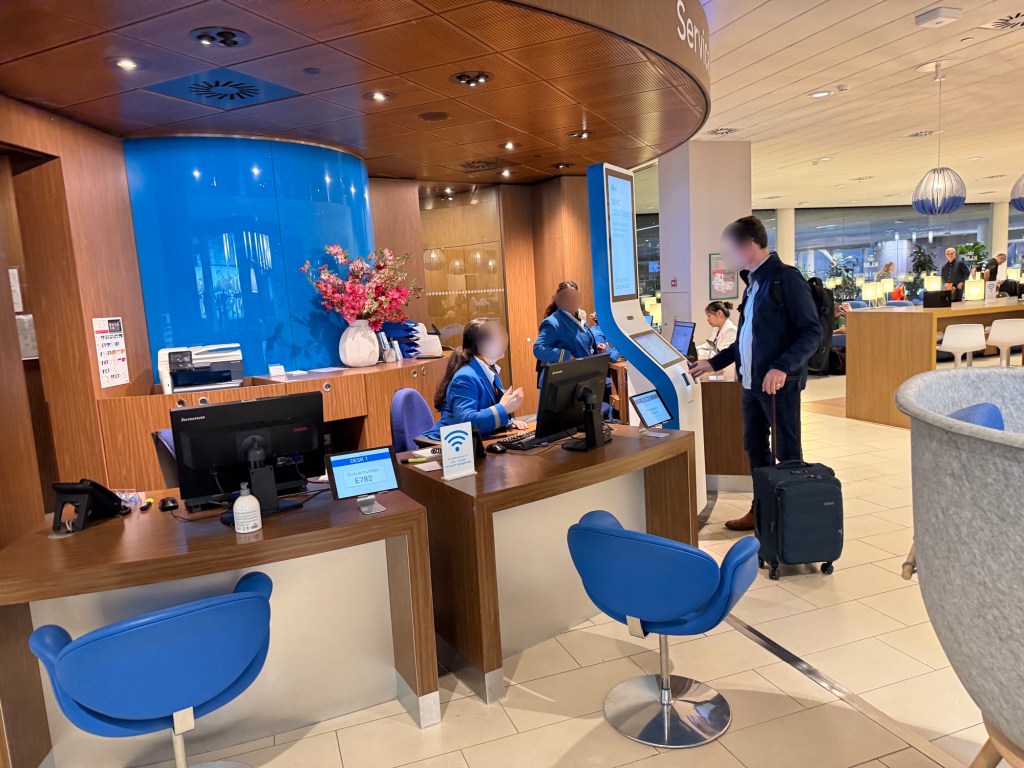 As you walk onward you’ll bump into the entrance to the lounge, with large glowing letters above the glass doors. I thought it was an attractive entrance, with the large, flowering plants on either side. Though the blue lettering really reminded my of Dutch supermarket chain Albert Heijn… Look it up if you don’t know what I’m talking about. To enter the lounge, you can either approach the desk and the staff can help you get checked in, or you simply scsn your boarding pass at one of the scanners. It may take a moment, but will then beep confirming your entrance eligibility.