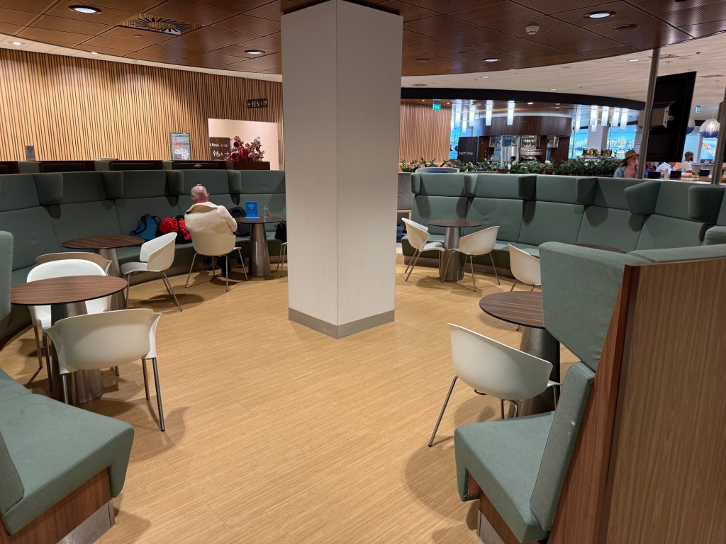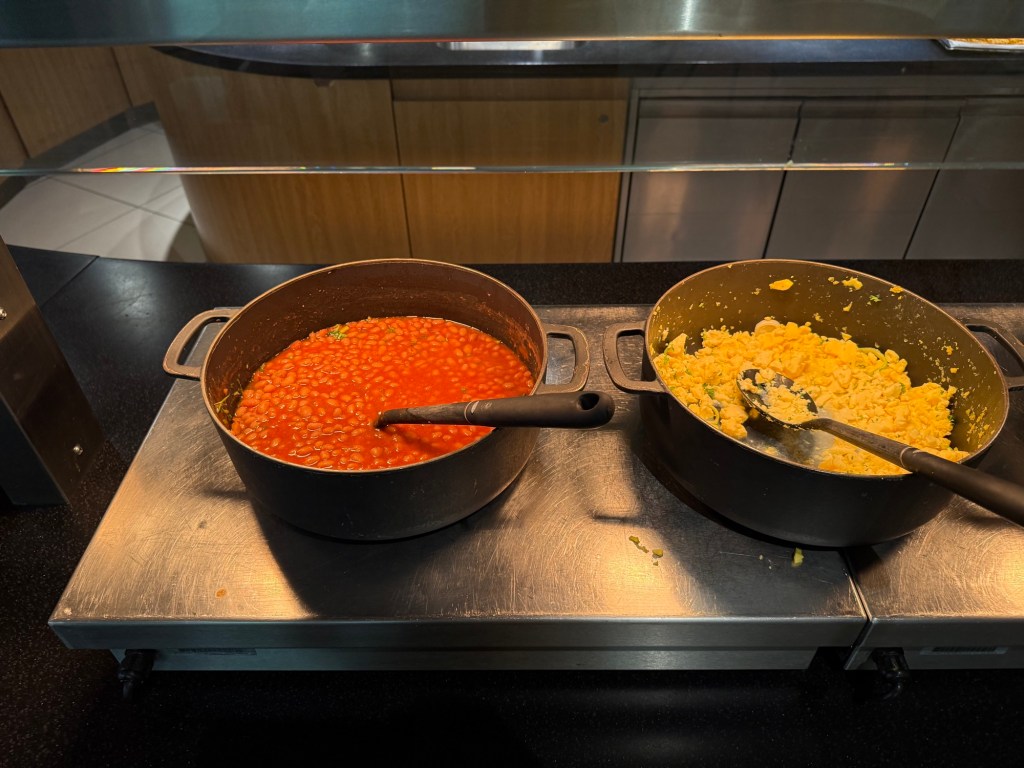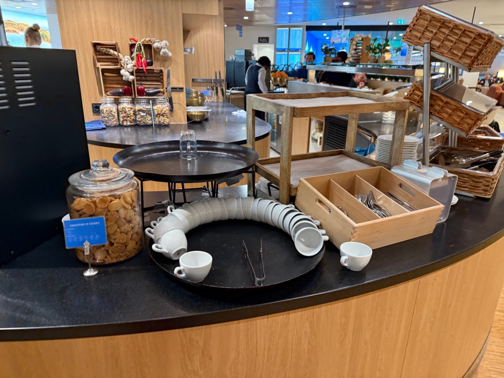 As you walk passed the entrance to the lounge, you also walk by one of two food stations. This is the smaller one, and it is more focused on bites and drinks rather than a full meal. Walk beyond it, and you’ll get to the true ‘dining’ area of the lounge, with restaurant-style seating consisting of tables with up to four chairs. I found this a relatively comfortable area to sit and eat breakfast, though by the time I left, around 9AM, it was pretty much packed with few free tables remaining.