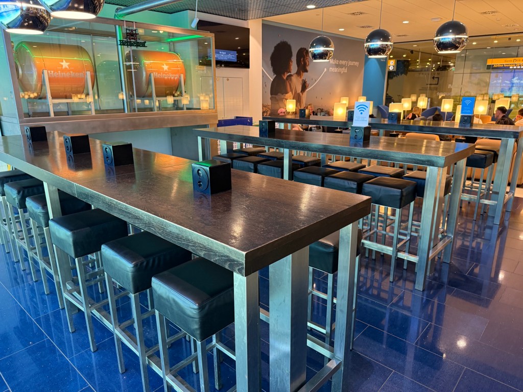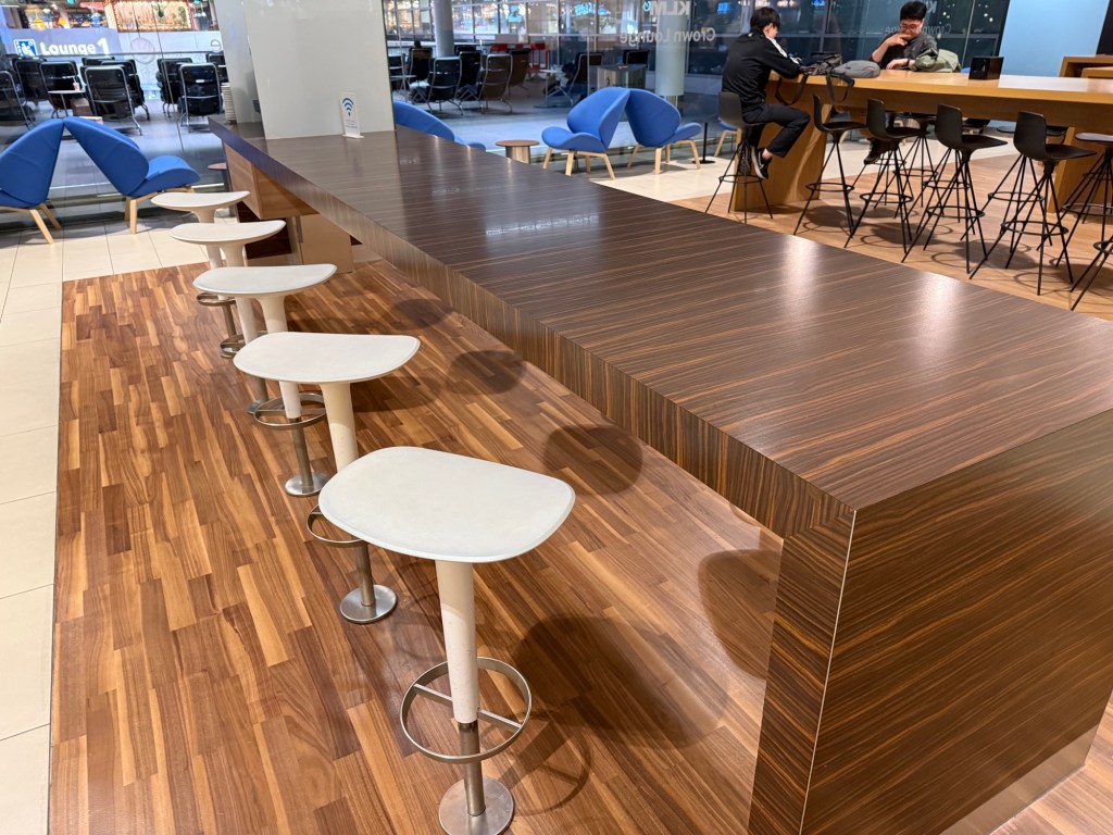 Just to the right of the Flying Blue Ultimate’s room are a few more high-top communal tables with different kinds of high-top seating: some with and other without a back rest. What’s nice here is that, unlike the other high-top tables closer to the lounge entrance, these seats are spaced a bit more generously. The big blocks you see on top of the tables are outlets, allowing you to charge your devices.