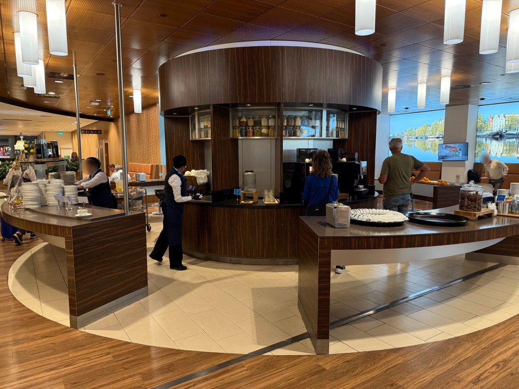 The KLM Crown Lounge No. 25 is not huge, but it is sizable. The design and aesthetics are very reminiscent of that of it’s non-Shengen counterpart. When you enter, you’ll find three broad areas to the lounge. Turning left you’ll find a large seating area, immediately in front and to the right will be a dining area, and all the way over to the right will be another large seating area. Each of these areas is roughly separated by a circular buffet with food and drink that rotates throughout the day.