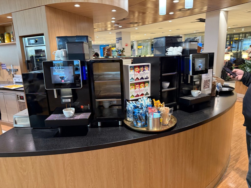 Overall, I thought the food selection at this breakfast hours was quite decent. I particularly enjoyed the (chocolate) croissants, of which I did eat several. I always like having some tomato and cold cuts as well. Truthfully, I didn’t think the hot options were anything special, but I liked the scrambled eggs and the mushroom dish, though I didn’t try the other options. Overall, the quality of this breakfast was not as nice, I thought, as the lunch options I had before at the non-Shengen Crown Lounge. However, I imagine this is largely due to the variety of options (which correlates with the fact that the non-Shengen Crown Lounge is much larger) and the time of day, since I visited the non-Shengen Crown lounge at lunchtime.