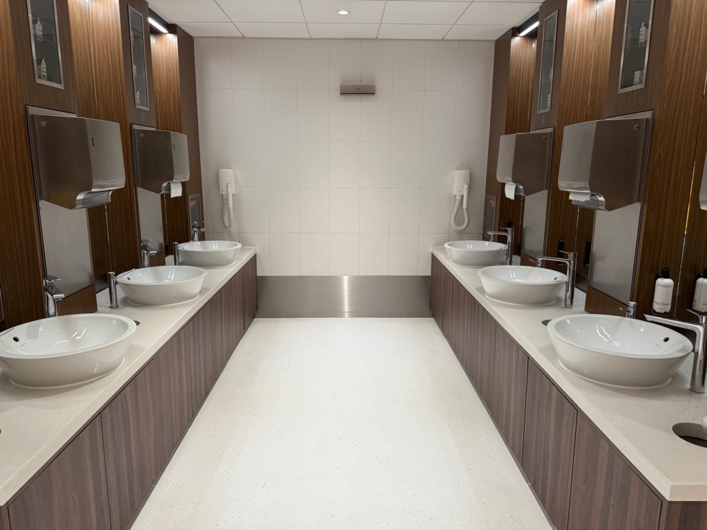 Entering the restrooms, you’ll first come across various sinks in a nicely designed area that feature a lot of wood and marble. I liked the bright lighting, and especially how clean the space is.