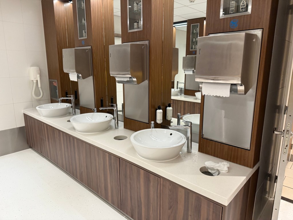 Overall, I was able to sit back, relax and have a solid breakfast at the KLM Crown Lounge No. 25. I liked the lounge design with its distinctive setaing areas and comfy lounge chairs. It’s not as elegant or beautiful as for example the JFK Delta One Lounge, or JAL’s Sakura Lounges in Tokyo – but that’s also not the design ethos of KLM. First and foremost, the Dutch – and KLM – prefer functional design. And I’d say that the KLM Crown Lounge is indeed functional, much like its non-Shengen counterpart. I liked the food generally, but wouldn’t say it’s something special. the restrooms and showers were clean and nicely designed.
