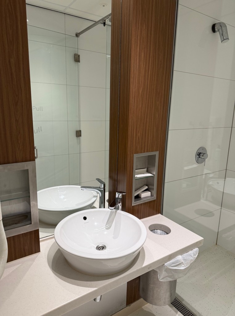 Walking back and going the other way at the split, you’ll get to the showers. The staff was nice enough to open a shower room for me that they had just cleaned, and let me in to take some pictures. I thought it was a very nice space and while not particularly big, it was functional. The sink had some spaces to the left and right with small shelves with some basic amenities. The shower cubicle itself was fairly large and nicely designed, but what I particularly liked was that the stall can be closed with a glass door! I really dislike this trend where half the stall is open, allowing water to splash everywhere… Never understood the point of that design… Glad KLM went the other way!