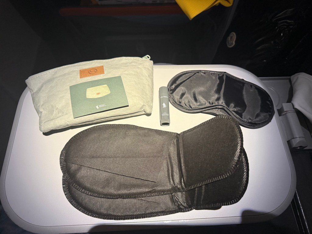 Singapore Airlines is not proactive with giving out amenity kits, but you are entitled to one in Premium Economy, though it is basic and comes in a rather sad-looking paper pouch. The amenities themselves however are welcome and include, slippers, an eye mask and lip balm.