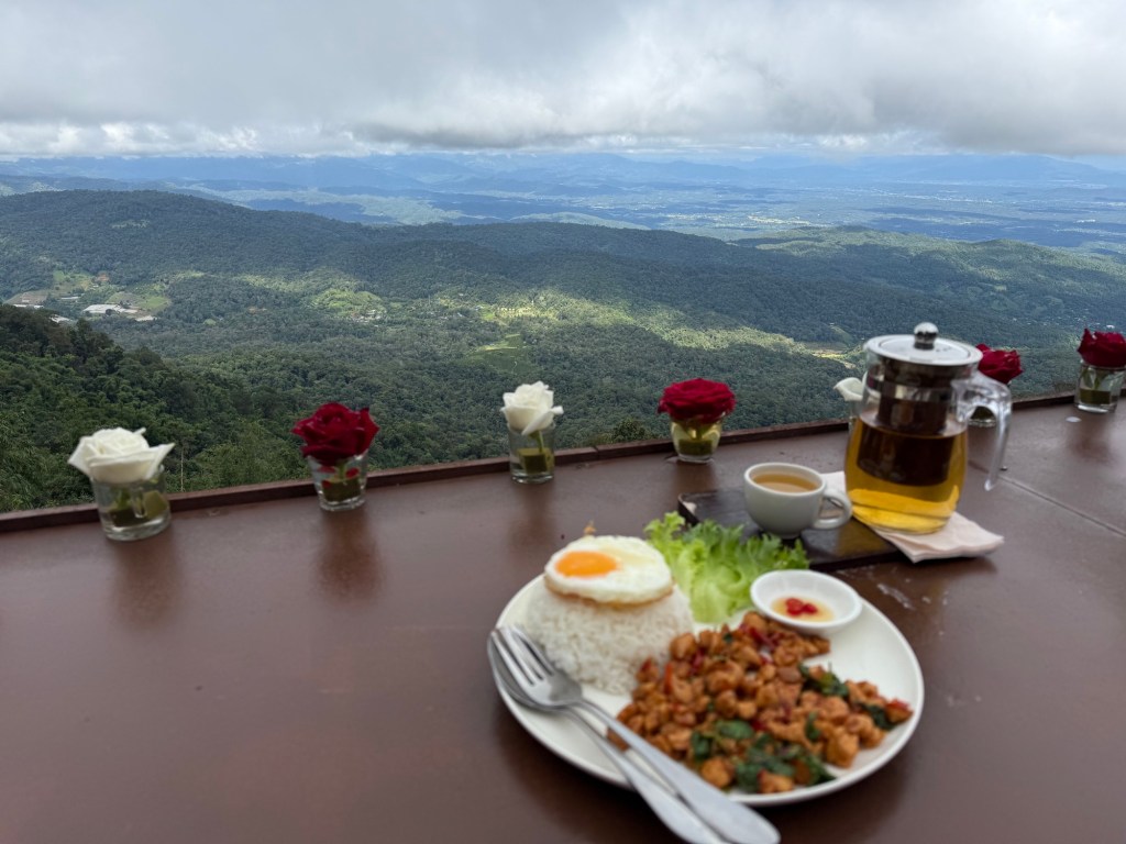 Waking up the next morning at the elephant sanctuary we were treated to the lovely views of the mountains, and had a hearty Thai breakfast. We then headed to the city for the remaining few days and got to go to the highest peak of Thailand (Doi Inthanon), see some fantastically beautiful temples (e.g. Wat Pha Lat), and have great food.