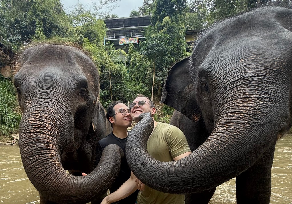 Upon arrival we spent the night with my husband’s family in Bangkok, then the next day we flew to Chiang Mai for a few days. We had a fantastic time there, first at an elephant sanctuary where we got to walk with elephants, wash them, and… get multiple elephant kisses…