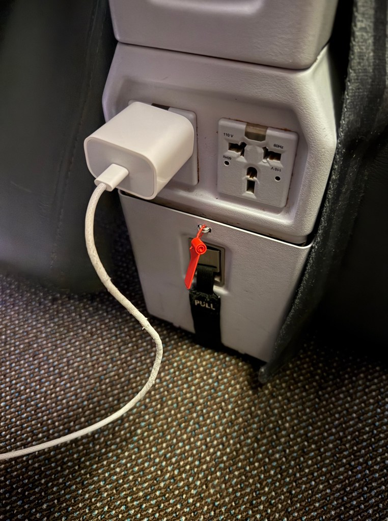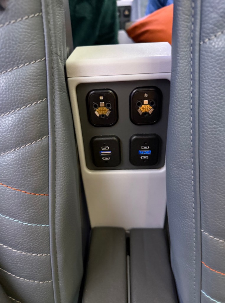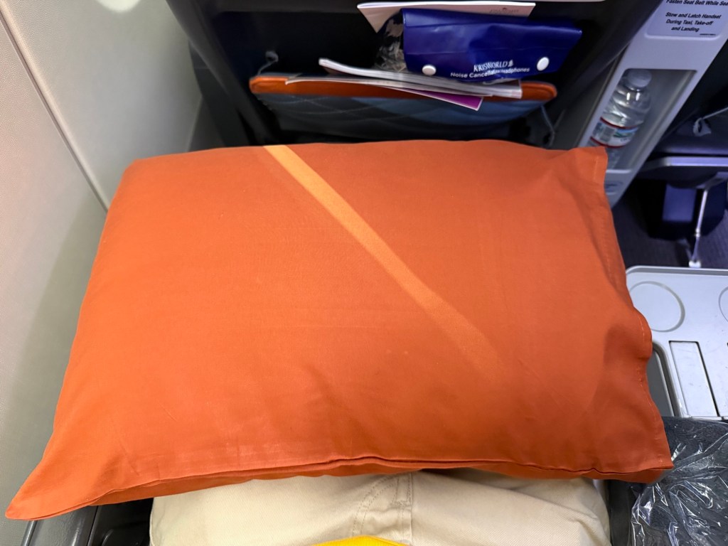 Initial impression of the seat was good. It’s certainly more spacious and better padded than the economy seats. One the seat were a substantial, thick pillow and a soft blanket, and premium noise-canceling headphones were in the seta pocket in front. In-between the seats is a broad armrest, with at the front edge cup holders.
