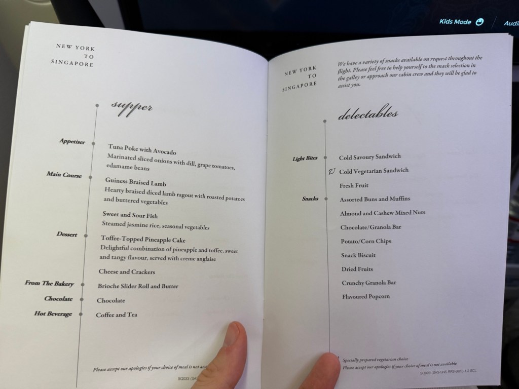 Dinner service started about 45 minutes after takeoff. However, already upon boarding menus were available in the seat pocket, see below for some photo from the contents. Note it contains both menus for the SIN-JFK and JFK-SIN legs, but I’m only showing JFK-SIN here. The menu includes the food loaded onto the plane, so the food that I pre-selected isn’t actually mentioned here. But, it does show the appetizers and desserts, which are the same for everybody regardless of the main dish that you pre-select.