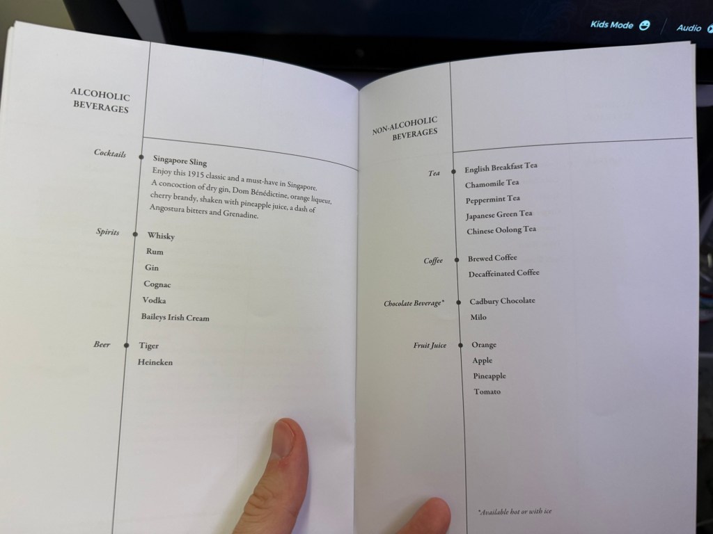Next, they came by to confirm meal orders. My husband and I had both used the ‘Book the Cook’ meal selection option. Singapore Airlines provides this on select flights, and allows you to pick from a substantial menu that includes special picks that you’d otherwise not be able to get if you’d rely solely on what’s available on the plane.