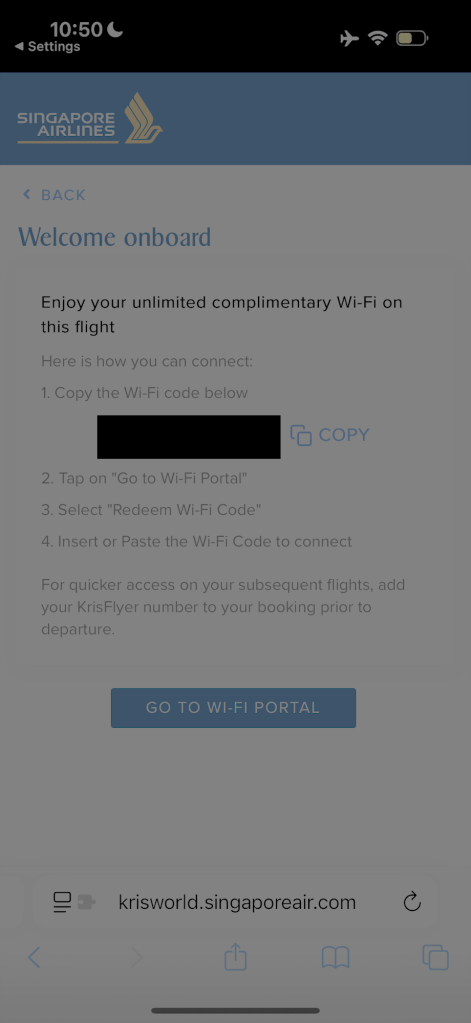 After waking up, I decided to go online for a bit and work a bit on some posts for Points to Seats. These days, if you’re a KrisWorld member (Singapore Airlines’ loyalty program), you can login to redeem a full-flight Wifi voucher. You log into your account through the Wifi portal on any device that connects to Wifi, and you generate a voucher after filling in the required fields. The code is generated, you copy this, and immediately redeem it. After you do so, you should get a message that you’re online. This connection can then be moved between devices.