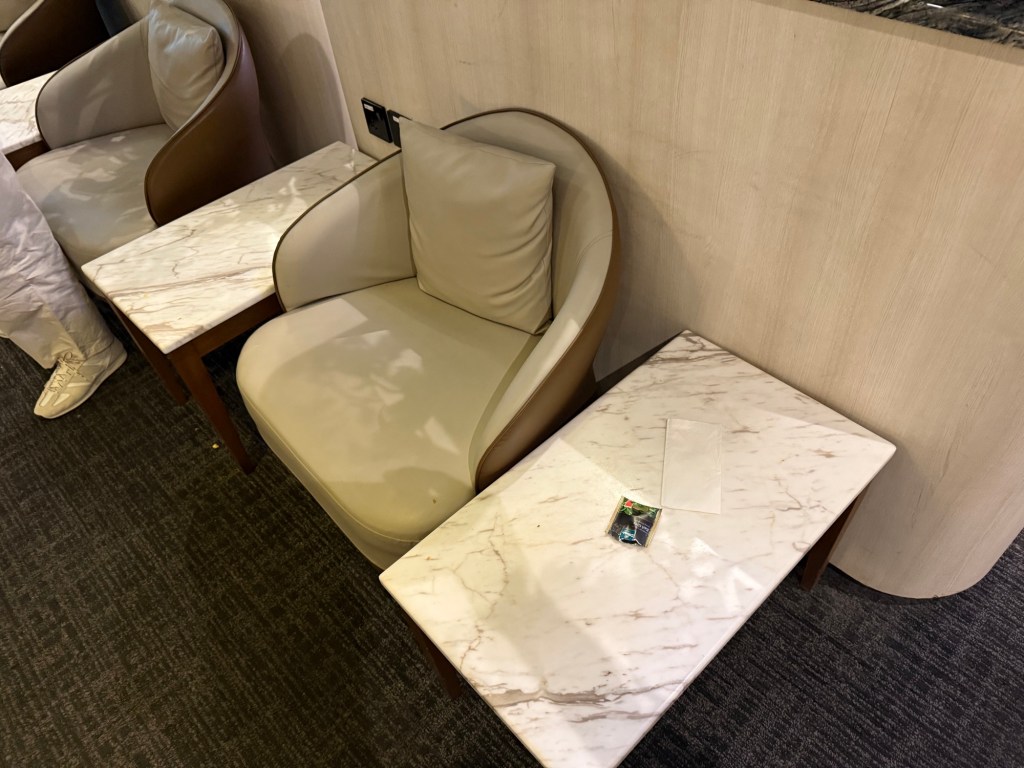 The far side of the lounge is all floor-to-ceiling windows and here is a slightly different seating arrangement. these are all still quads, but the chairs are slightly different and there are no plants here. Mind you, there is no view as you’re looking at the back of one of the terminal buildings. Also, I felt that the upholstering had seen better days, as there were some damages and stains.