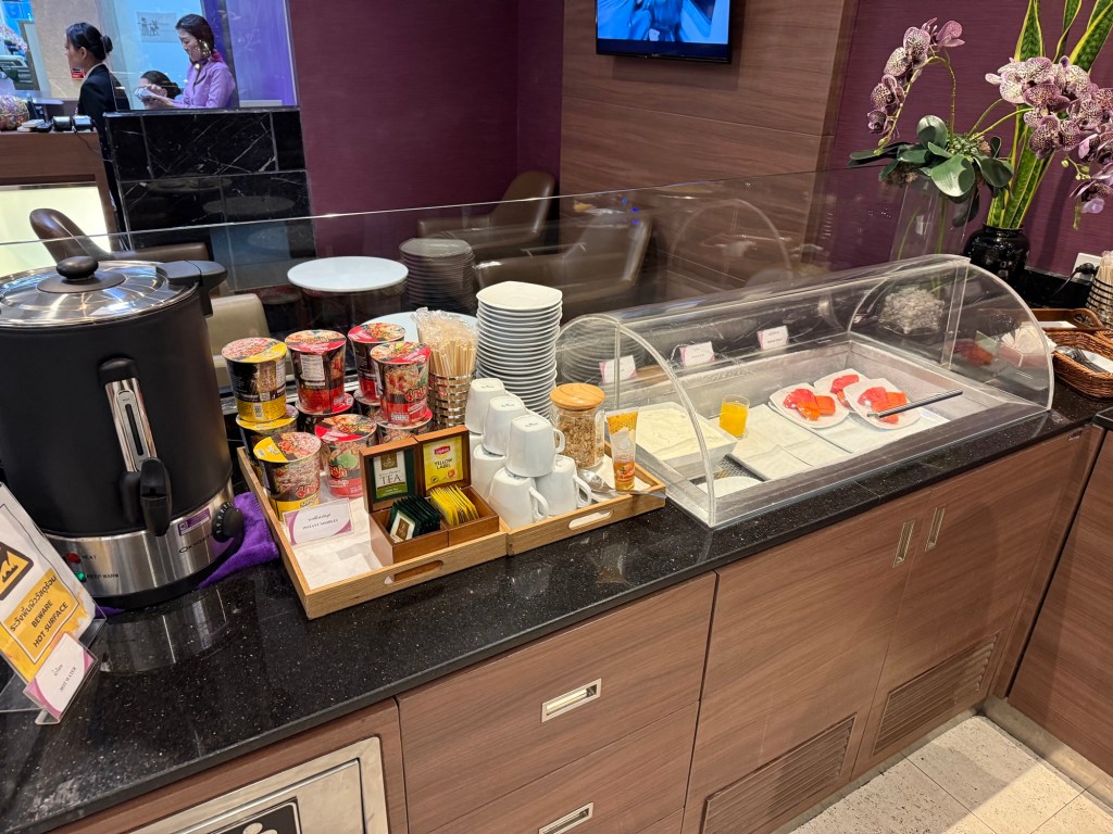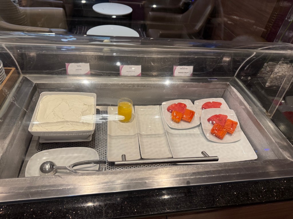 Moving on the the main part of the buffet, this was arranged in an L-shape with a variety of options. Starting at the entrance of this buffet was a large thermos for hot water, and variety of instant noodle cups. There were also tea bags to make tea. Directly beside that was a cooler that had a large bowl of yoghurt, some pre-poured drinks, such as orange juice, and some plates of cut fruit. Now if I’m honest, I thought this was a rather awkward presentation that, in my mind, limits options for guests and increases the workload for the staff. Instead of 4-8 glasses of orange juice, why not a large carafe with juice and empty glasses to the side, like in virtually any other lounge? Same with the fruit: why not simply provide a tray with cut fruit of various kinds, rather than have this pre-plated?