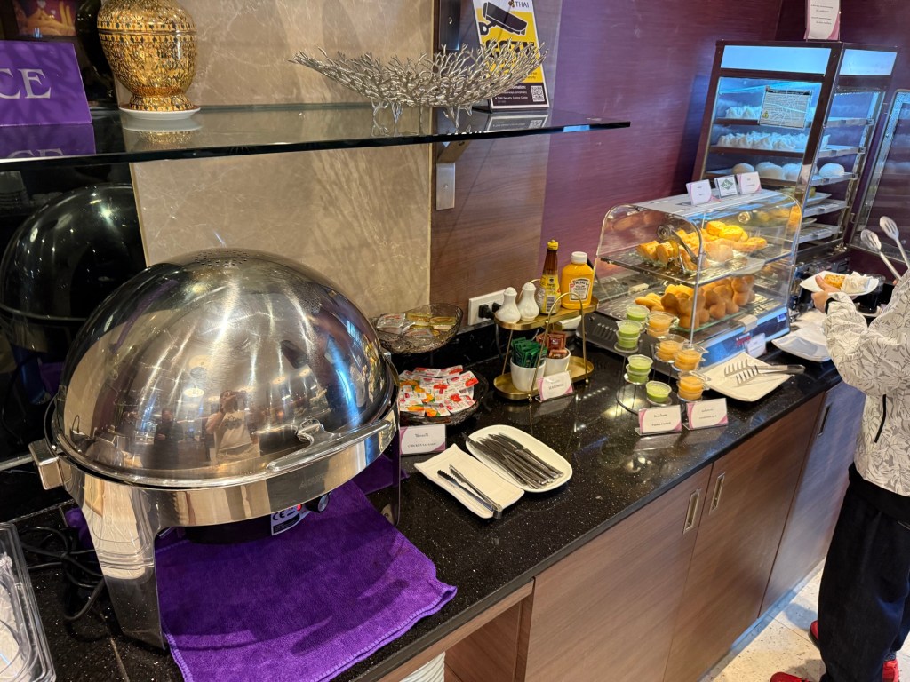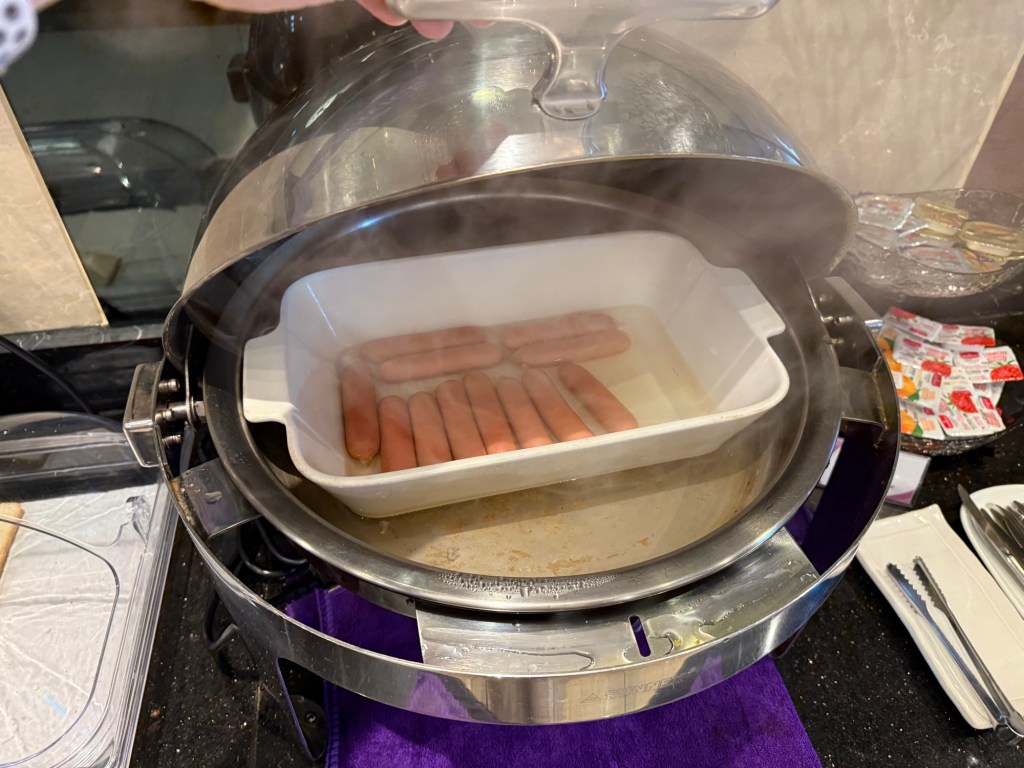 Moving on, next are some hot options. This included omelets, right by the cutlery. Then follow toasters and sliced breads. By the bread is another hot food option, which appeared to be hot dogs.