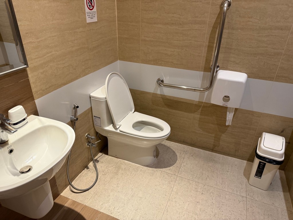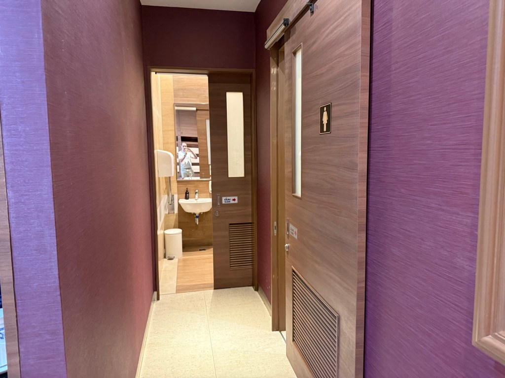 Despite the small size, the lounge does have dedicated men’s and women’s restrooms. You get here by following the main walkway past the buffet and turning left. The women’s restroom is on the right and is for just a single person at a time, while straightahead is the men’s restroom. This can be used by up to two people at a time. That is because there is a urinal as well as a stall. Both restrooms were fairly clean maintained okay.