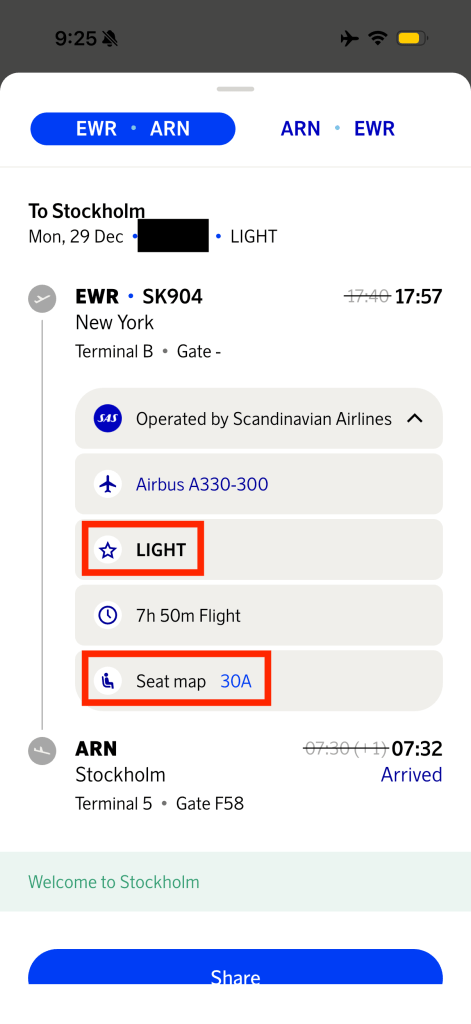 Hello from Sweden! I sit here at an airport cafe in the check-in hall of Stockholm’s Arlanda Airport Terminal 2, having just come off my flight with Scandinavian Airlines (SAS) from Newark EWR. I had not meant to do a review of this flight, but an unforeseen event has led me to do so anyway, and I want to give a brief description/quick look of what happened. Because anyway I’m waiting for my mother to arrive, as she is flying in from Amsterdam, and I need to kill 2.5 hours…