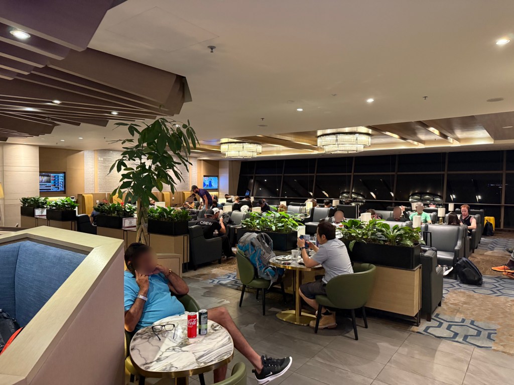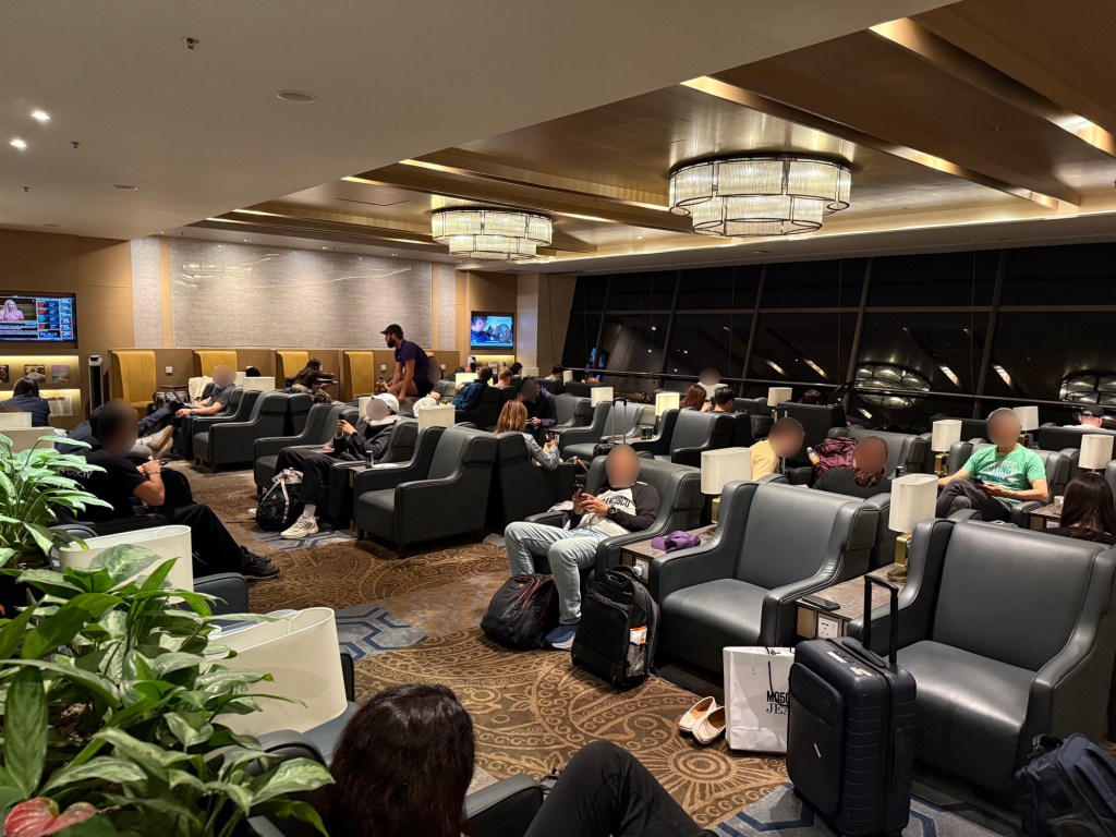 Once you enter the lounge you’ll find yourself in a 7000sqft space that has a few distinct ones. Immediately in front is a large seating area dedicated to lounge chairs and relaxation, with large, floor-to-ceiling windows. At this time it was already pretty dark out, so I couldn’t tell you what the view was actually like. The space overall was quite elegant, with large chandelier-like light fixtures and an emphasis on wood and earthy tones. You will notice it was quite busy, and at the entrance we were warned of this.