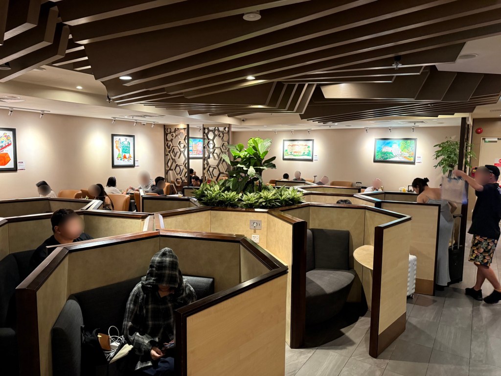 While on the other hands the cubicles below are smaller but allow much more privacy, thanks to the walls on all sides. All of these come equipped with a small table and power outlets, as well as a ready light. I did notice that the power outlets are the British style. Fortunately there were also USB plugs, or I wouldn’t have been able to charge anything in this lounge.
