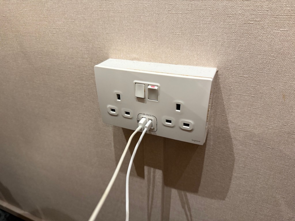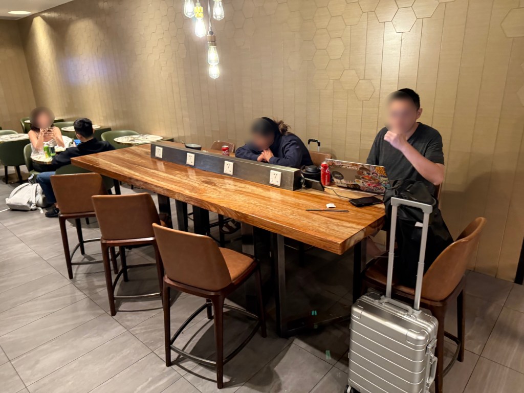 The two of us took a seat toward the back of this space. Here, tables were setup with comfy chairs of various kinds, offering a hybrid dining-lounging setup. I say hybrid because this setup is neither a true dining setup nor a particularly relaxing lounge setup, so it’s a little in-between. But if you want to eat something while sitting comfortably, this isa. good place to sit. The electrical plus here were also the British type, but also provided USB plugs, fortunately.