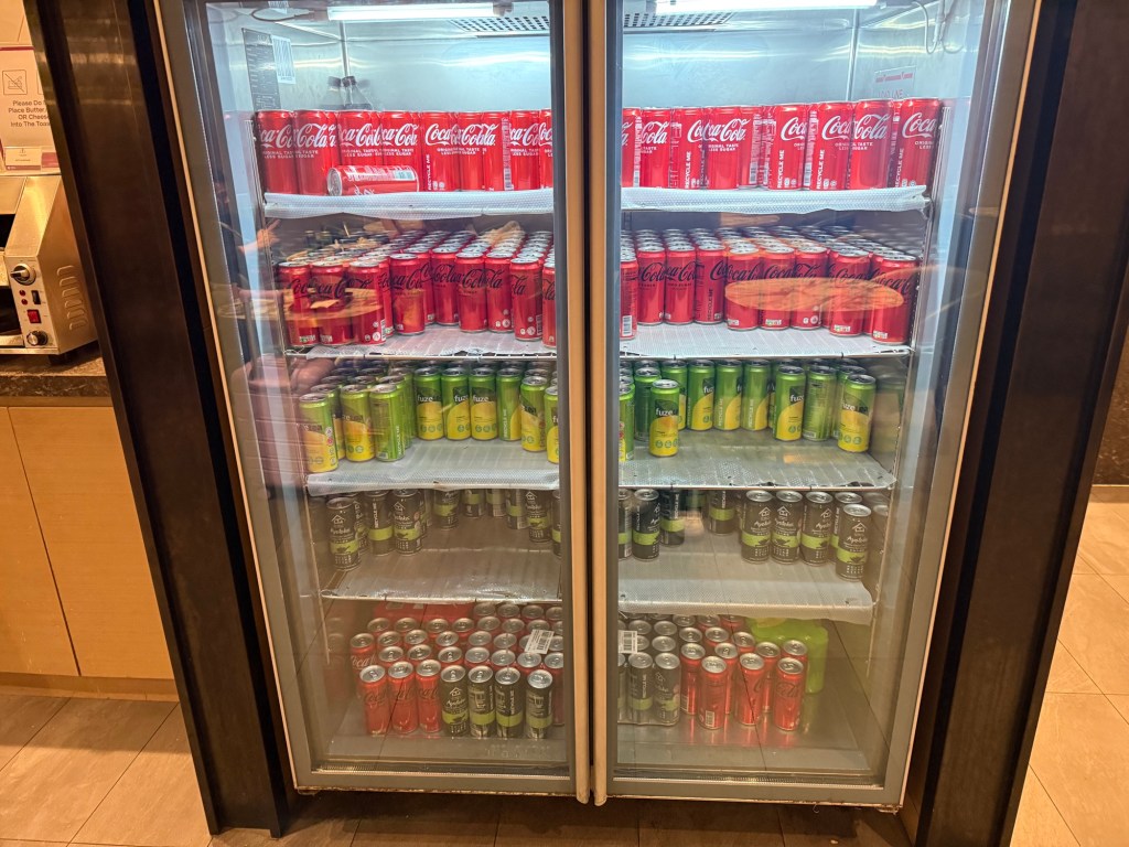In terms of drinks, the usual selections were available. There two hot drink machines that could make a selection of coffees, or just hot water for tea. However, one of these appeared to malfunction. otherwise there was a fridge was a variety of canned sodas.