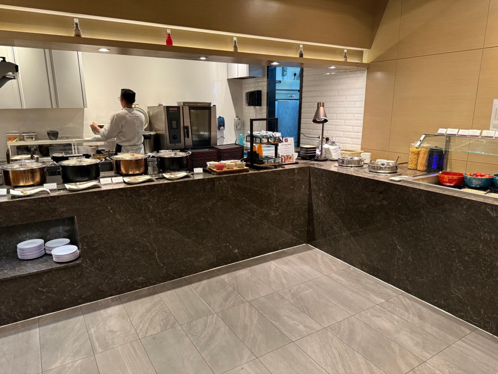 A true dining setup could be find opposite of the main lounge space, by the buffet. Here there was a true bar where you can order various (alcoholic) drinks. A little beyond the bar was the full buffet, as well as the dining seating. This consisted of a large communal table with power plugs in a center console. Behind that were a collected of dining tables with two chairs each. These looked elegant, but I thought it was interesting virtually nobody chose to sit here. Truthfully it was rather late and I’m guessing nobody was in the mood to eat (I know I wasn’t).