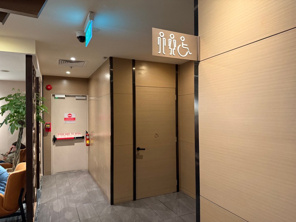 This lounge has both restrooms and showers. Unfortunately, don’t expect to easily get a spot for the shower and if you enter with priority pass, this is an extra charge. When we entered a priority pass guest reserved a spot on the schedule, and paid $100 for this.