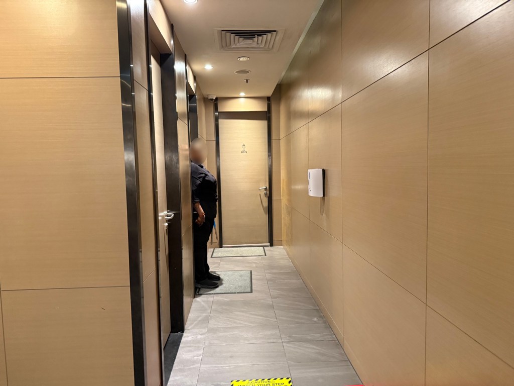 Beside the corridor that leads to the showers is also a separate corridor that leads to the restrooms. The men’s restroom is at the end of the corridor.
