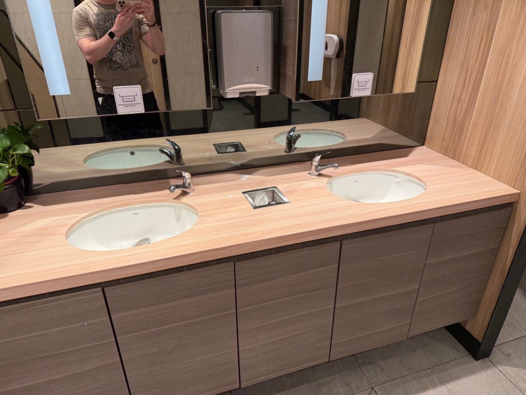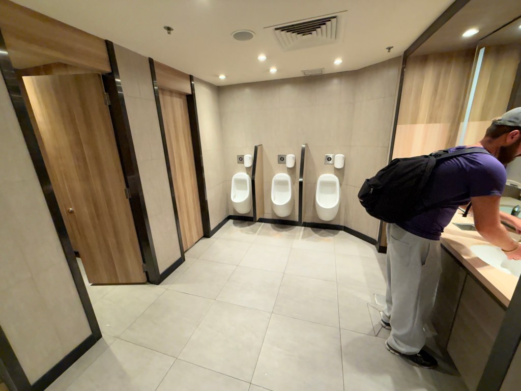 The size of the restroom and the number of urinals and stalls seems generally fitting for the size of the lounge, and I’ve never seen a line form, despite the level of crowding in the lounge, further, the restroom was kept nice and clean throughout our stay. There were three urinals, two stalls, and two sinks.