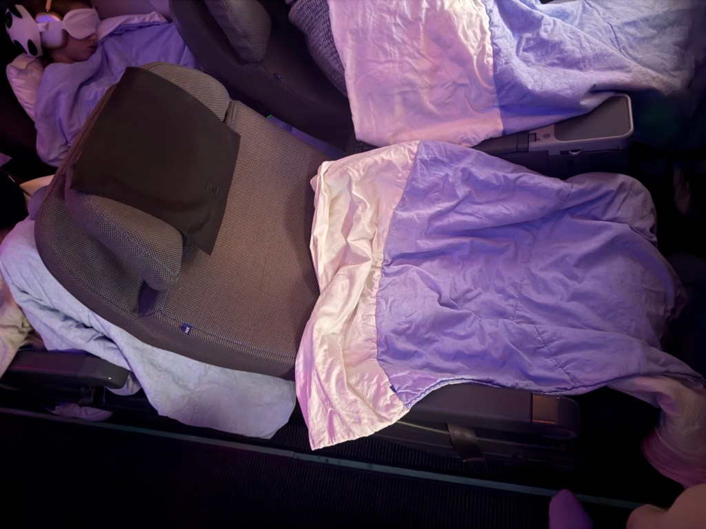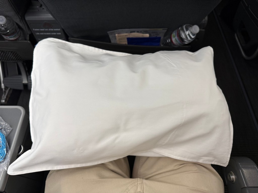 As I ahd mentioned earlier, the Premium Economy seats have an 8″ recline and 38″ pitch, so it wasn’t too hard getting comfortable. While of course not fully flat, I felt that this recline was quite generous as I was able to lean back a lot. Paired with the pleasant blanket I was able to get comfortable fairly easily. A more substantial pillow would have been welcome, but it was perfectly sufficient. See below an impression of what the seat, when fully reclined, looks like.