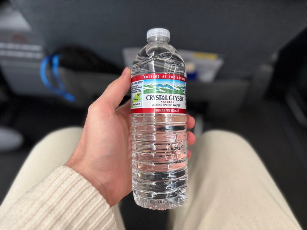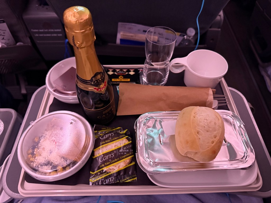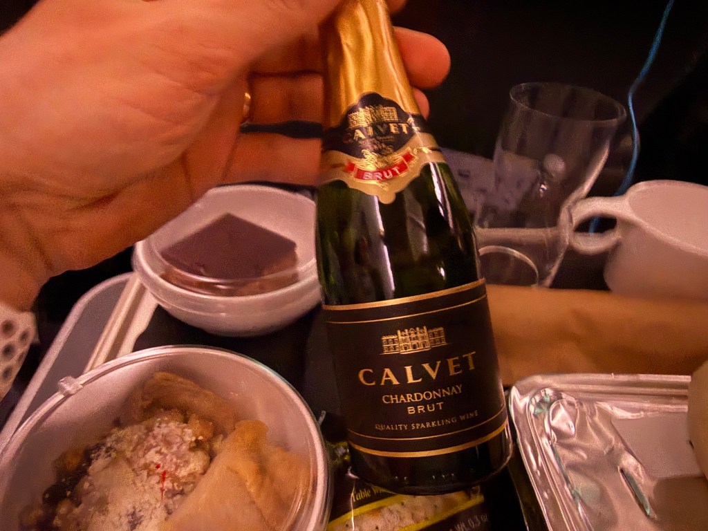 Since I was upgraded, I’m not so sure if it’s possible to preorder a meal or not. In business class this option was available. On board, there were only two options, described to me as a beef stew and a pasta dish. So, I select the beef stew. For a drink, I went with the Calvet sparkling wine, which came in a cute bottle. Other options included red and white wine, beer, and a variety of soft drinks and juices.