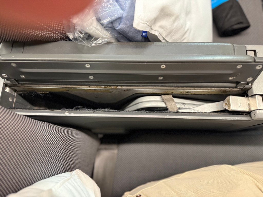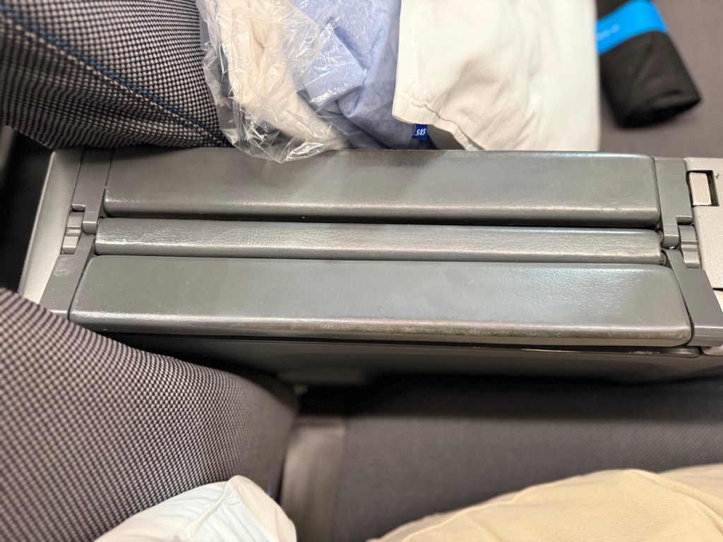 The middle parts can be folded open to pull out the tray tables. Those were quite a bit smaller than I thought they might, and I also felt like they were a little bit on the flimsy side. Putting my particular table back into the armrest also wasn’t the easiest thing, as it seemed like it would get stuck on something and not go down all the way. As a matter of fact, on the screenshot immediately below this paragraph and on the left, you can see the armrest not fully down: this was because the table didn’t fold down all the way. With a good smack, though, I was able to fix that. I suppose these are some of the issues you can expect with an older cabin!