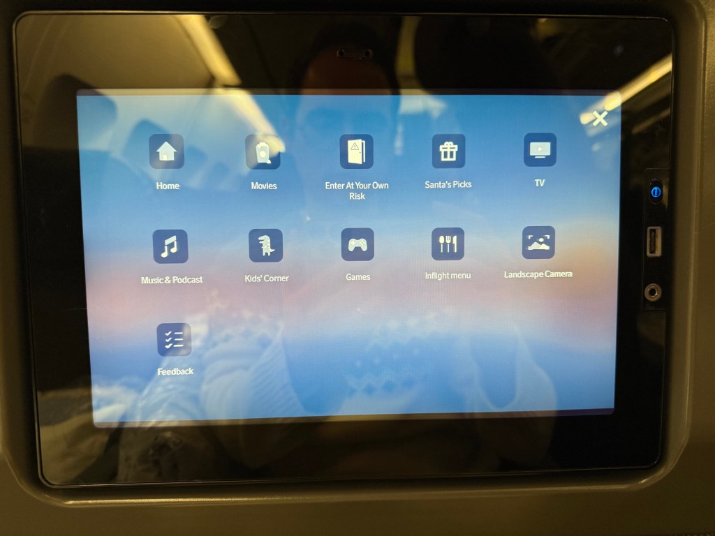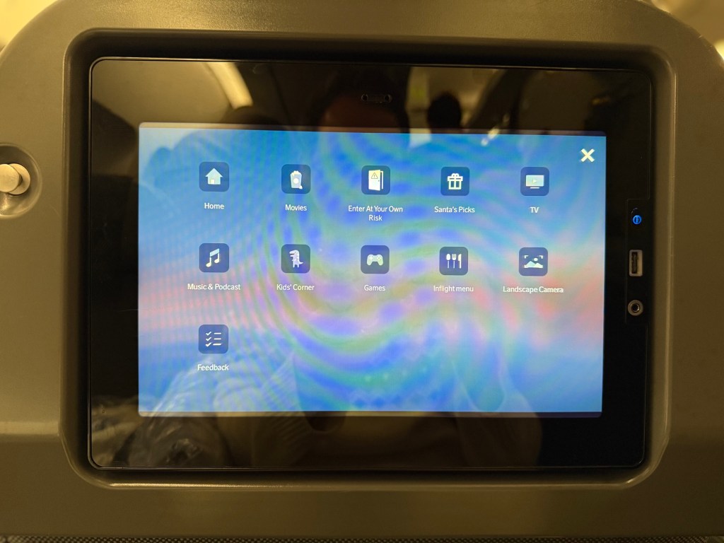 The entertainment monitor is a 13.3″ HD monitor, and appears quite crisp with good color balance. It was not the most responsive touchscreen in the world, but it was certainly functional enough to easily select options. The UI and organization of the system is a topic I’ll get to later, because I’d say it’s a little different from what I’m otherwise used to. To the right of the display were also a USB-A port and a headphone port.