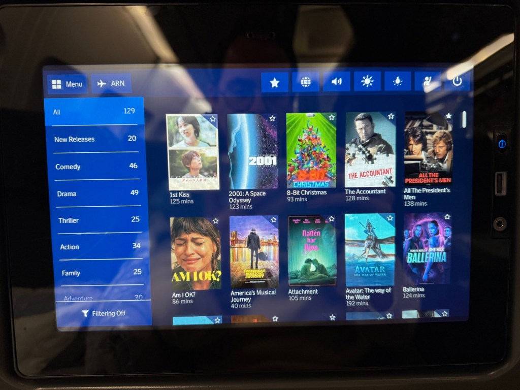 While you can select certain movies and such from the ‘home screen’, that menu button is essentially the only way to navigate the entertainment system. While it’s perfectly intuitive, there’s some duplication in button functions that seems superfluous. For example, the ‘movies’ button will bring you to all movies, while ‘enter at your own risk’ and ‘Santa’s Picks’ will bring you to scary and Christmas movies, respectively. I was traveling around Christmas so I suppose Christmas and Halloween movies are appropriate genres to call out, but it seems like an unnecessary source of confusion. As you can see, there are 129 movies in total.