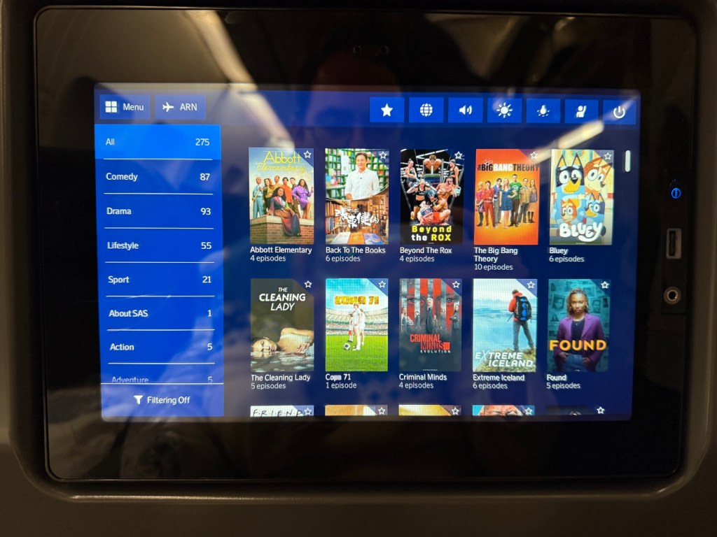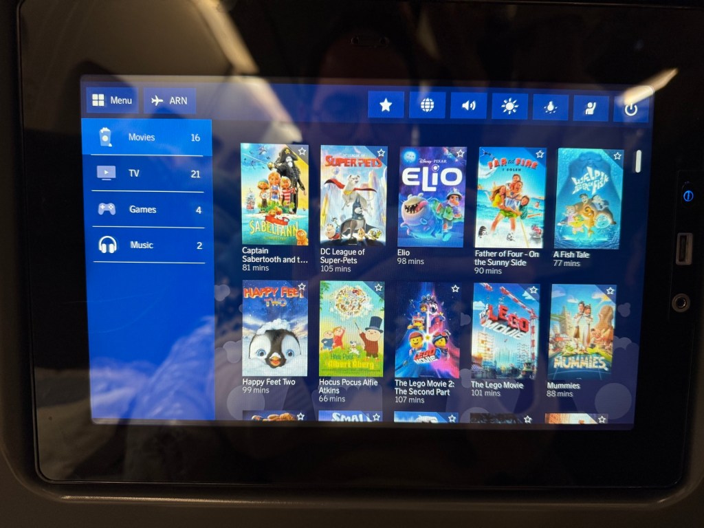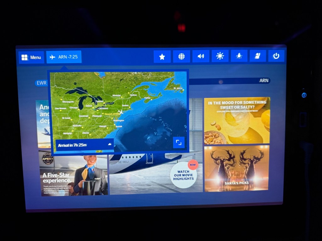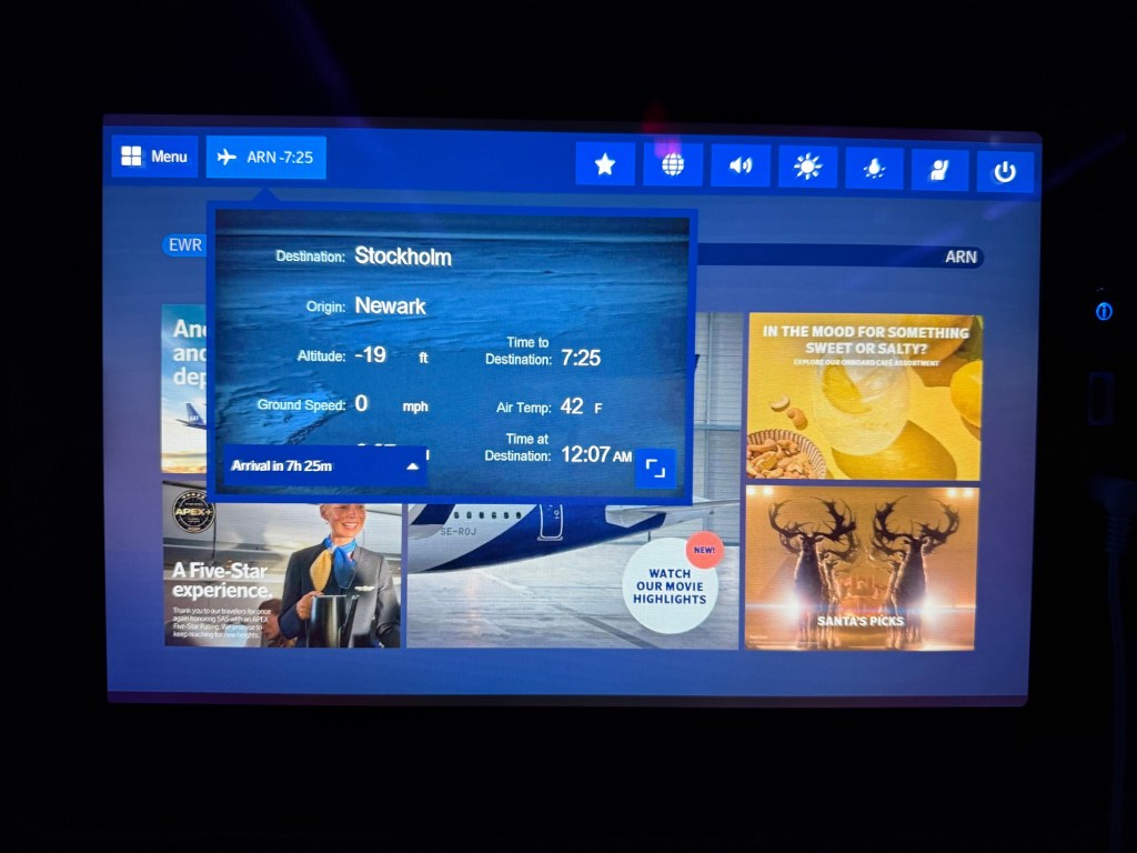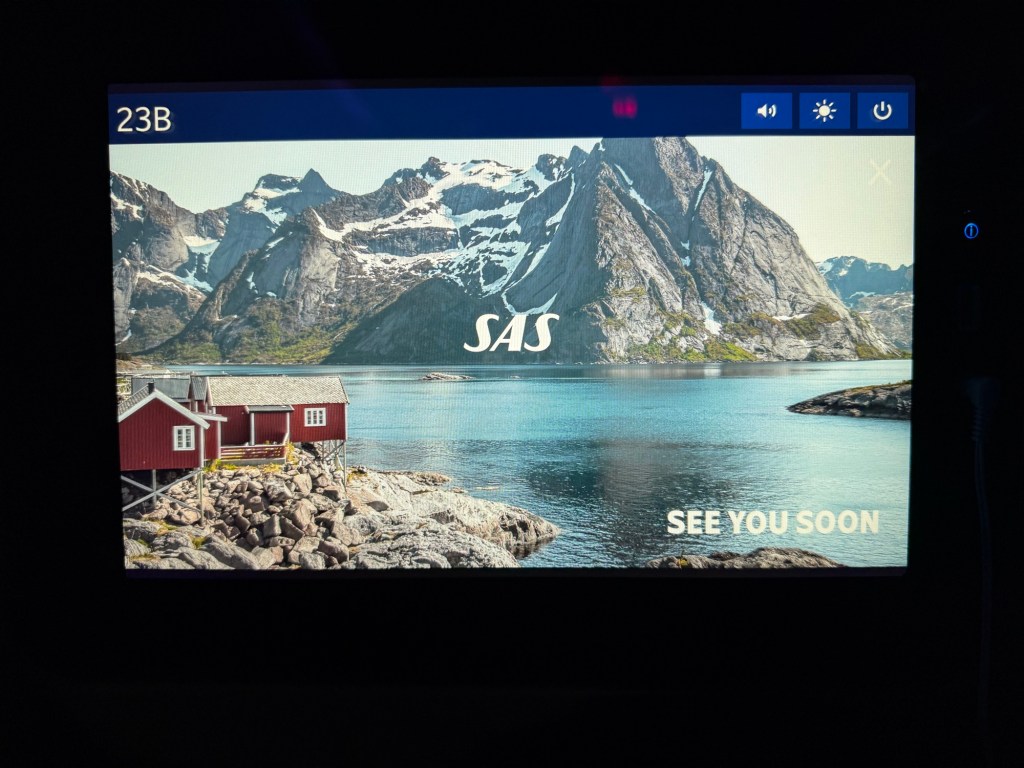 Following dinner, I settled in to watch a movie, covering myself with the lovely blanket. SAS’s entertaiment system has a minimalistic UI that’s similar to that of an iPad, while simultaneously lacking much of the normal airplane entertainment system UI elements you may be accustomed to.