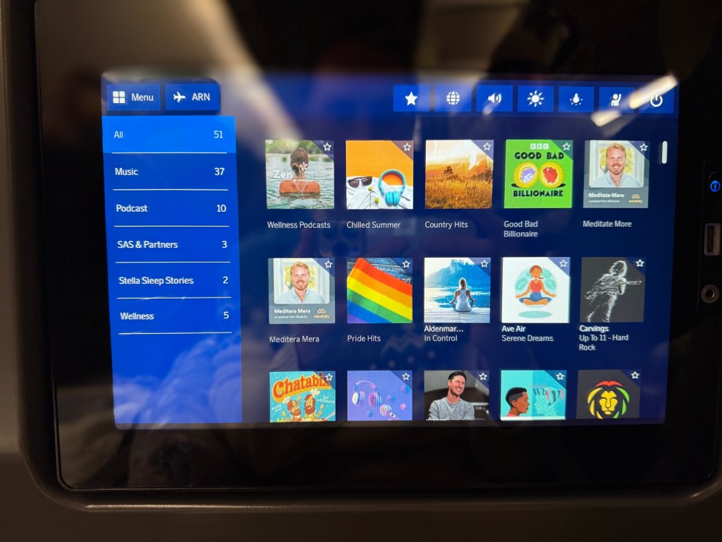 The starting interface has just the SAS logo and a ribbon with buttons up top. Once you ‘get started’, you’ll be asked to select a language, and the ribbon on top will add a menu button, a flight progress button, and a favorites button. The rest of the UI shows featured content for various kinds of media, allowing you to swipe back and forth and select recommended or often-watched movies, shows or music. The ‘flight progress’ initially just shows a pop-up window, which can be expanded into a fullscreen interface. Pressing the menu button expands to the aforementioned iPad-like interface.