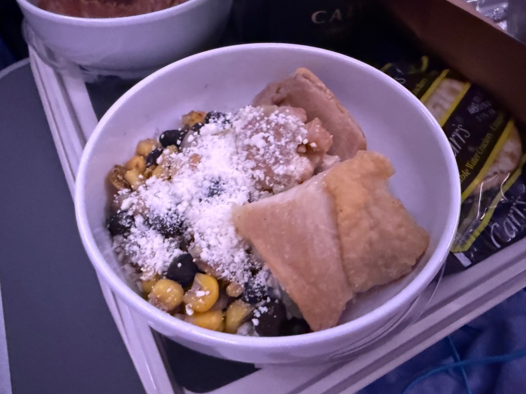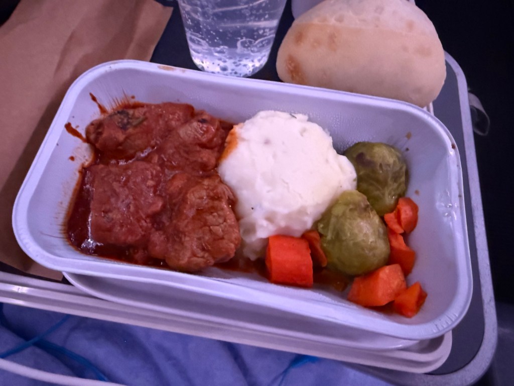 Shortly after takeoff the pilot come on the PA to make his announcements. It’s here that he welcomed everybody on board, and mentioned that there’d be quite a lot of turbulence a little later into the flight. On the plus side, this prompted the fastest dinner service I’d ever had on a plane. Because, as the flight attendant explained when he served my neighbor his meal: “we’re trying to get everybody fed before the turbulence hits”.