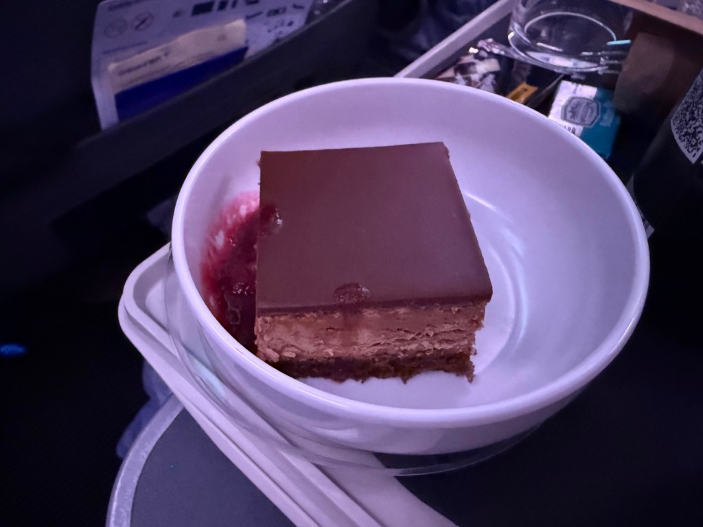 Overall, this was a very nice dinner service that was nicely differentiated from the economy dinner service. The portions are substantially bigger, the cutlery is metal and the dishes, while not ceramic, of a heavier and more substantial material then i economy. Further, there is a larger selection of drinks (alcoholic and otherwise), and the service is more attentive. I was left with a good impression and was ready to relax with a movie before getting some shut-eye.
