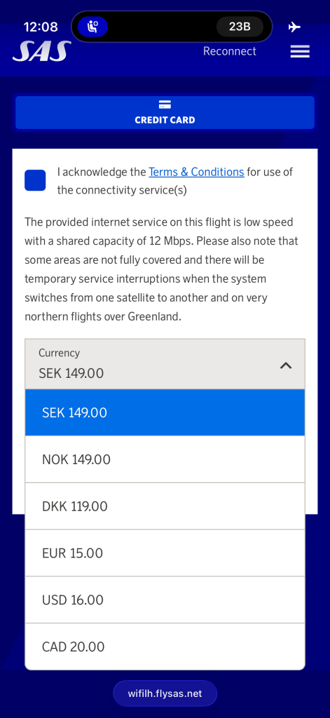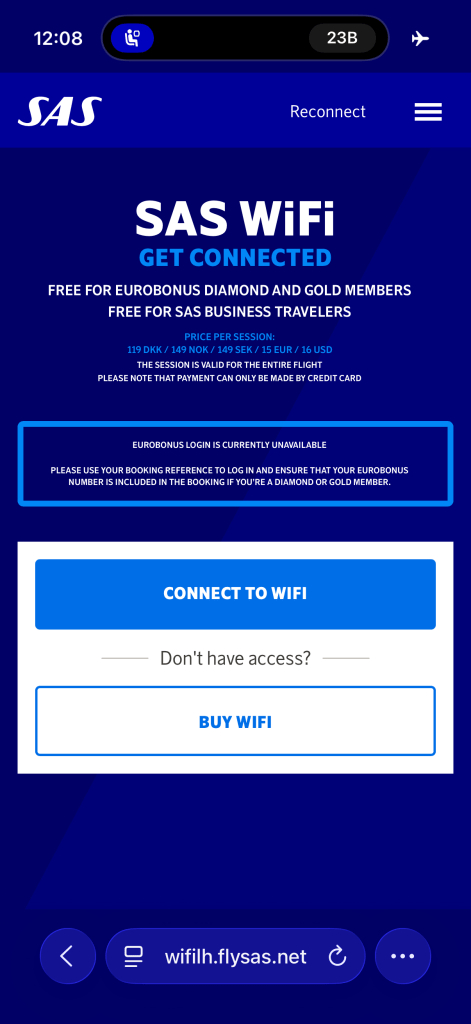 Finally, there was also an inflight WiFi option. I had tried to use this before, when I flew business class with SAS, but at the time I wasn’t able to even connect. This time around I was able to connect. It proved simple: simply connect to the inflight WiFi through your device’s WiFi settings page, and you’ll be able to navigate to the wifilh.flysas.net start page. From here, you can directly connect for free if you’re in business class, or otherwise you can buy a WiFi pass. For the full flight you’ll pay $16, which seems cheap, but note that SAS admits that the speeds can be slow. I didn’t buy the WiFi pass, so I can’t vouch for how fast or slow this really is, though I’ve anecdotally heard that speeds are usually quite good.