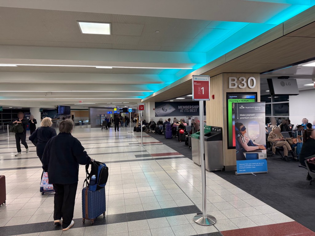 Boarding with KLM at New York-JFK proceeds as follows: they post signs with the 5 boarding groups along the gate area (rather than as lines in front of the gate). Closest to the gate is Zone 1 (business class), and then behind that are signs for zones 2 and 3 (Premium Comfort, Flying Blue Gold and up, and those seated in Economy Comfort). Then, opposite the sign for Zone 1, on the other side of the gate, are signs for Zones 4 and 5 (Economy). Then, while zones are called in order, everybody sort of ends up in one long line and unfortunately those with a higher boarding zone that arrived late can’t easily get preferred treatment over others since it’s one massive queue at that point.