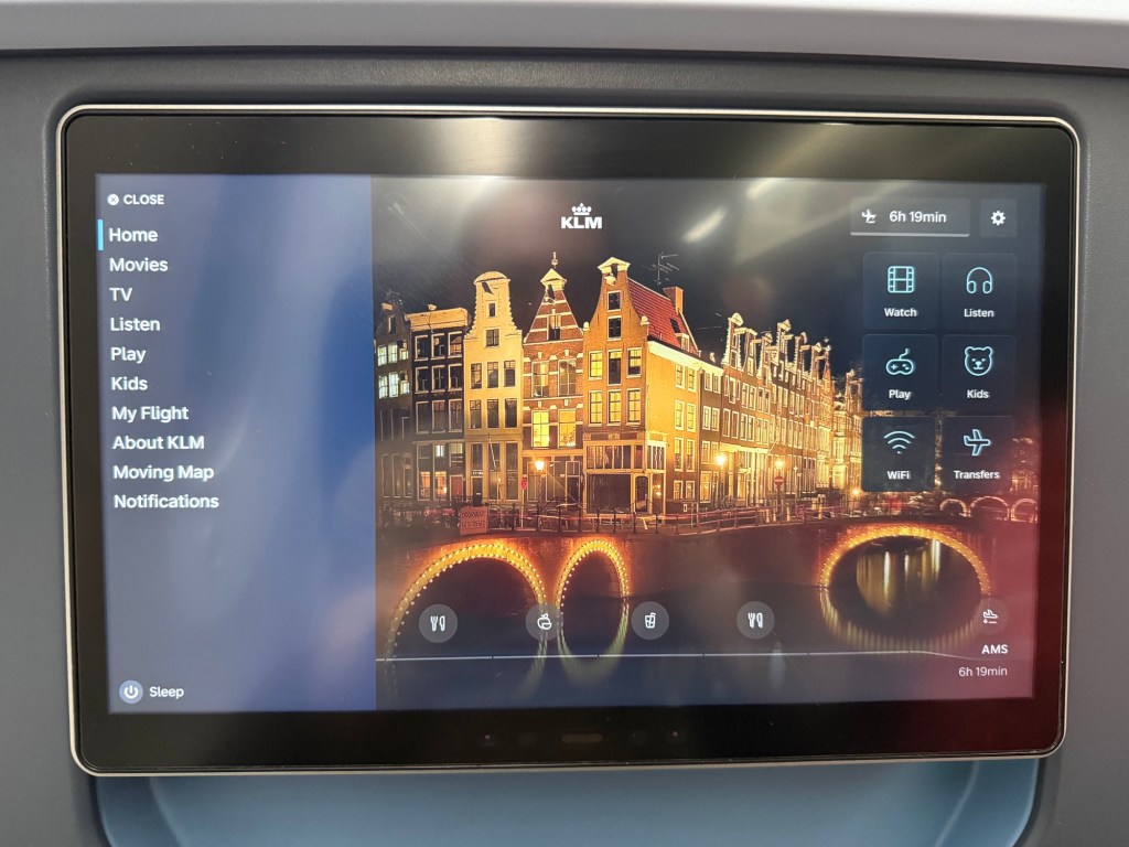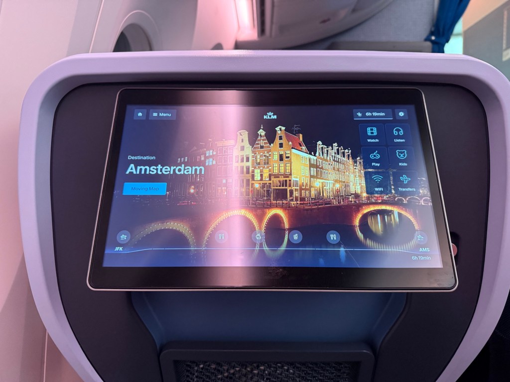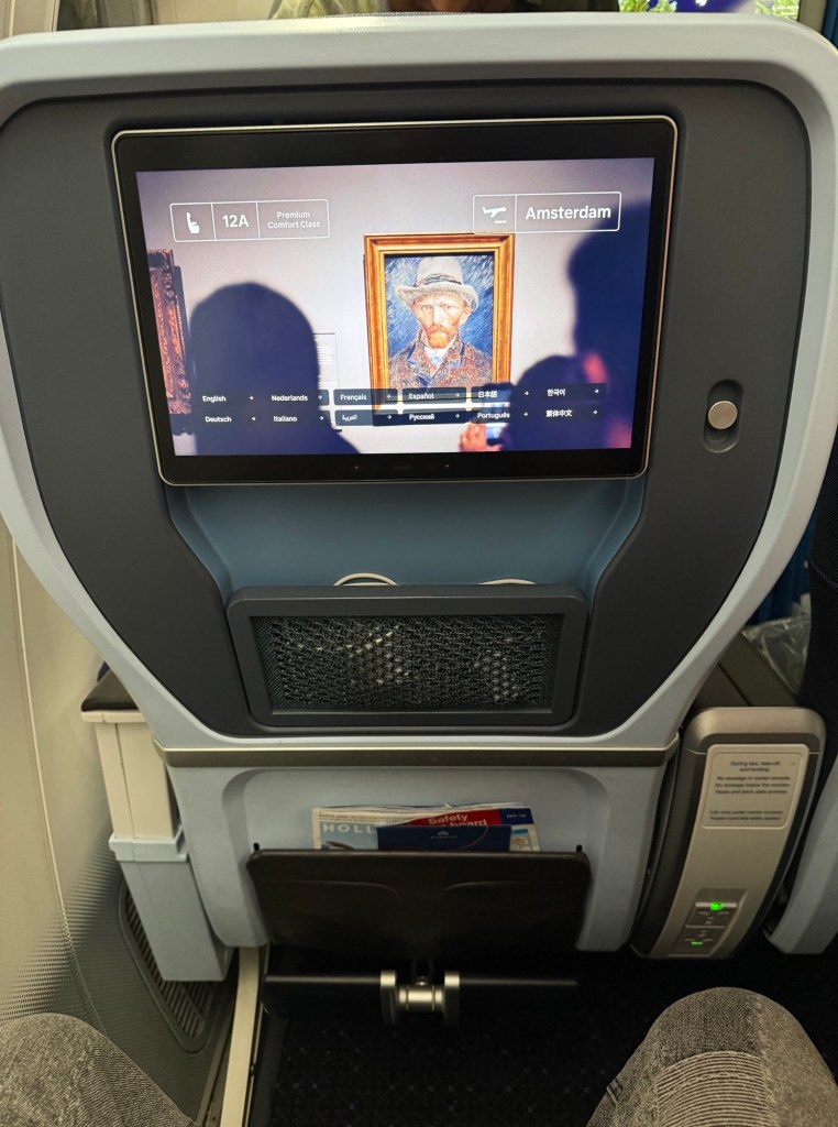 Overall, I find KLM’s premium economy seat to be very comfortable. It’s quite wide, the padding is good throughout, and I thought the location of buttons, plugs and storage was thoughtful. As I got mys tuff in order, I felt like this was going to be a comfortable flight!